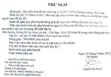 Theo phản ánh, ngay trong buổi họp phụ huynh đầu năm ngày 9-9 vừa qua, phụ huynh của 48 HS lớp này đã phải đóng gần 500.000 đồng tiền mua dụng cụ học tập. Ngay hôm sau, họ đồng loạt nhận được một bức thư ngỏ với nội dung: “Hiện tại lớp 1/3 chưa có tivi, đầu máy để phục vụ học tập. Kính đề nghị quý phụ huynh đóng góp để mua. Việc này hoàn toàn do phụ huynh tự nguyện đóng góp để phục vụ việc học của con em mình…”.