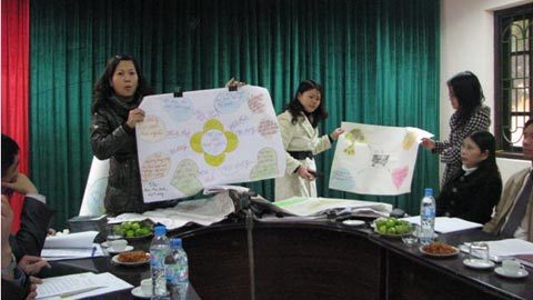 | Các cô giáo trường THCS Nguyễn Quốc Ân (thành phố Hưng Yên) giới thiệu với đoàn kiểm tra sơ đồ tư duy do HS của mình trình bày |