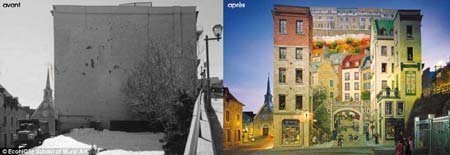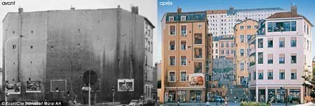 | Một bức tường trống khác sau khi được vẽ lên trông như một tòa nhà gồm nhiều cửa hàng, ban công. |