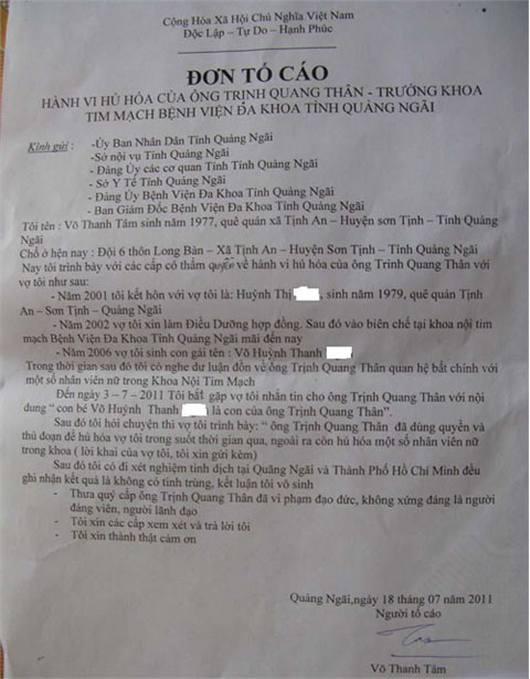 Theo lời “nạn nhân” là anh Võ Thanh Tâm (SN 1977), ở thôn Long Bàn, xã Tịnh An, huyện Sơn Tịnh, Quảng Ngãi thì sau khi lập gia đình vào năm 2001, đến năm 2002, vợ anh là Huỳnh Thị N. (SN 1979), xin và được nhận vào làm nhân viên điều dưỡng ở Khoa Nội-Tim mạch, BVĐK tỉnh, do ông Trịnh Quang Thân, làm Quyền Trưởng khoa.