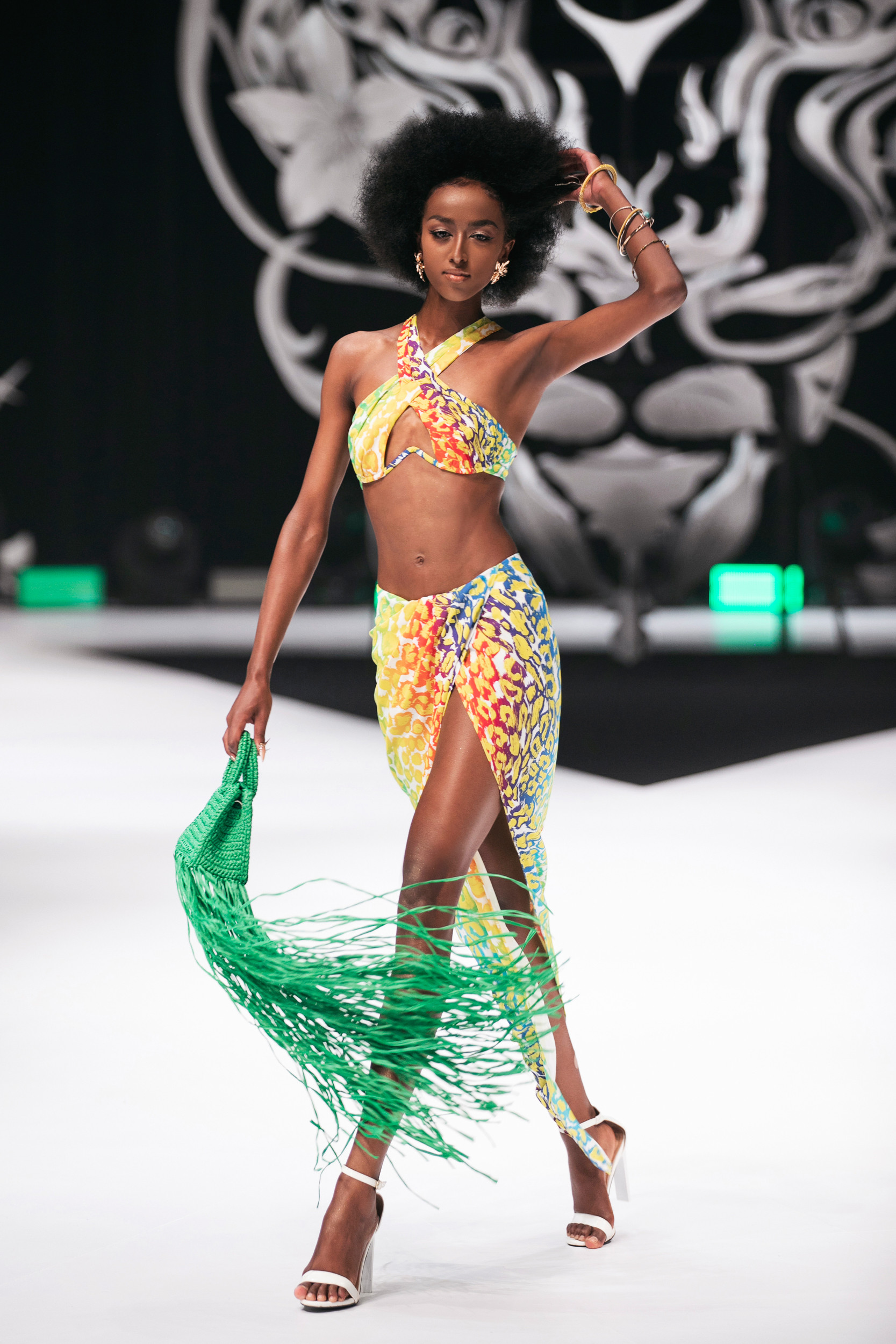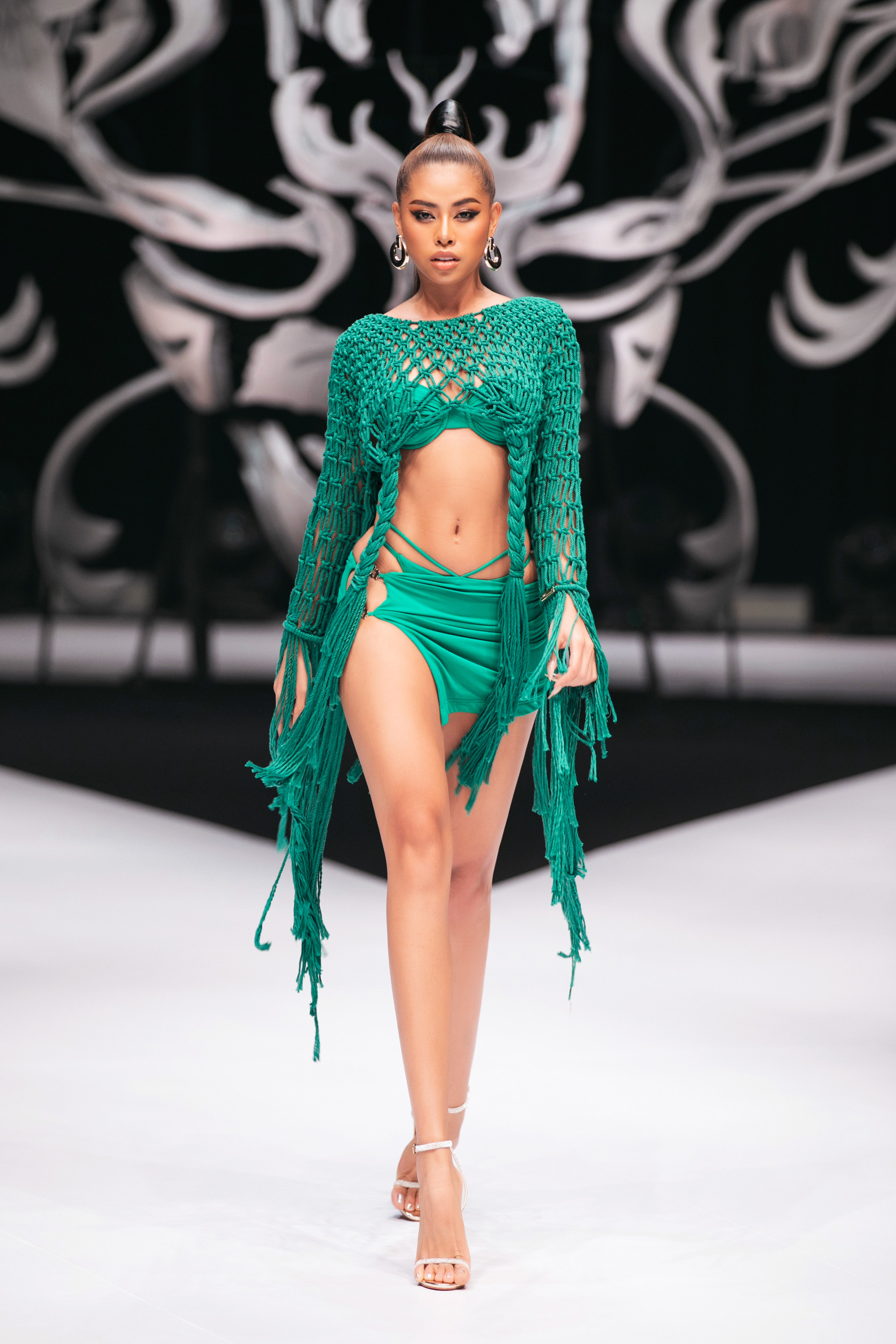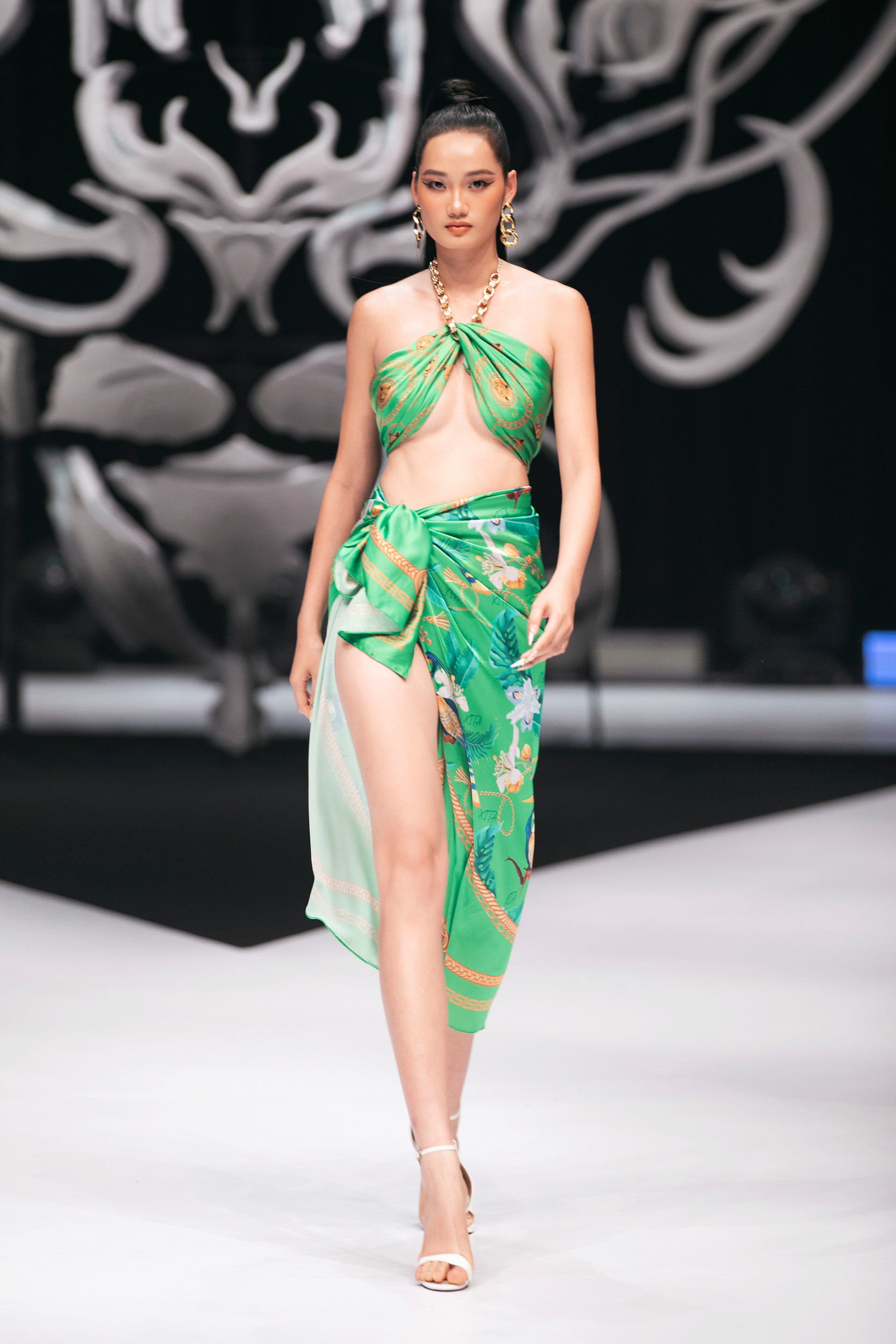 Minh Triệu mở màn cho show với áo bơi cut-out màu trắng. Thiết kế giúp cô khoe đôi chân dài thẳng tắp trên sàn catwalk.