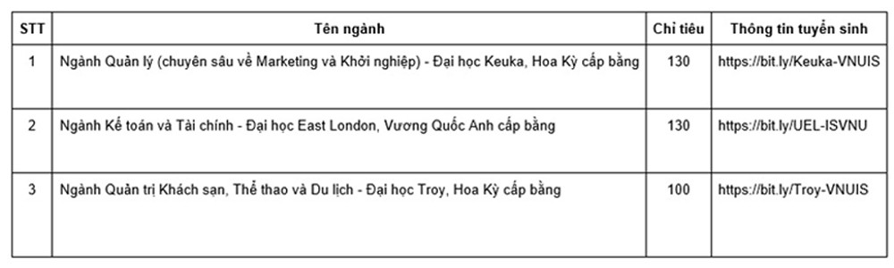 Ngoài ra, Trường Quốc tế tiếp tục nhận hồ sơ xét tuyển bằng học bạ các chương trình liên kết đào tạo quốc tế do trường đại học nước ngoài cấp bằng. Trường nhận hồ sơ tới khi hết chỉ tiêu, thí sinh đăng ký xét tuyển trên cổng thông tin trực tuyến tại: https://ts.isvnu.vn
