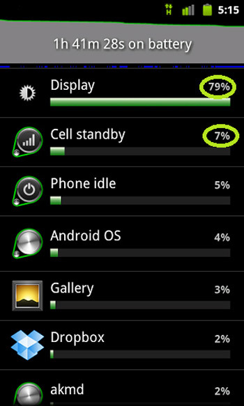Bước 4: Nhìn vào danh sách các ứng dụng đang chạy xem chúng tiêu hao bao nhiêu năng lượng của máy. “Display” thường là “thủ phạm” số 1 khiến điện thoại chóng hết pin.
