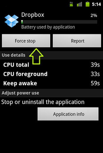 Bước 5: Nếu bạn đang không sử dụng một ứng dụng nào đ, trong khi nó vẫn tiêu hao nhiều năng lượng của máy, bạn hãy chọn vào ứng dụng đó và nhấn vào nút “Force stop”.