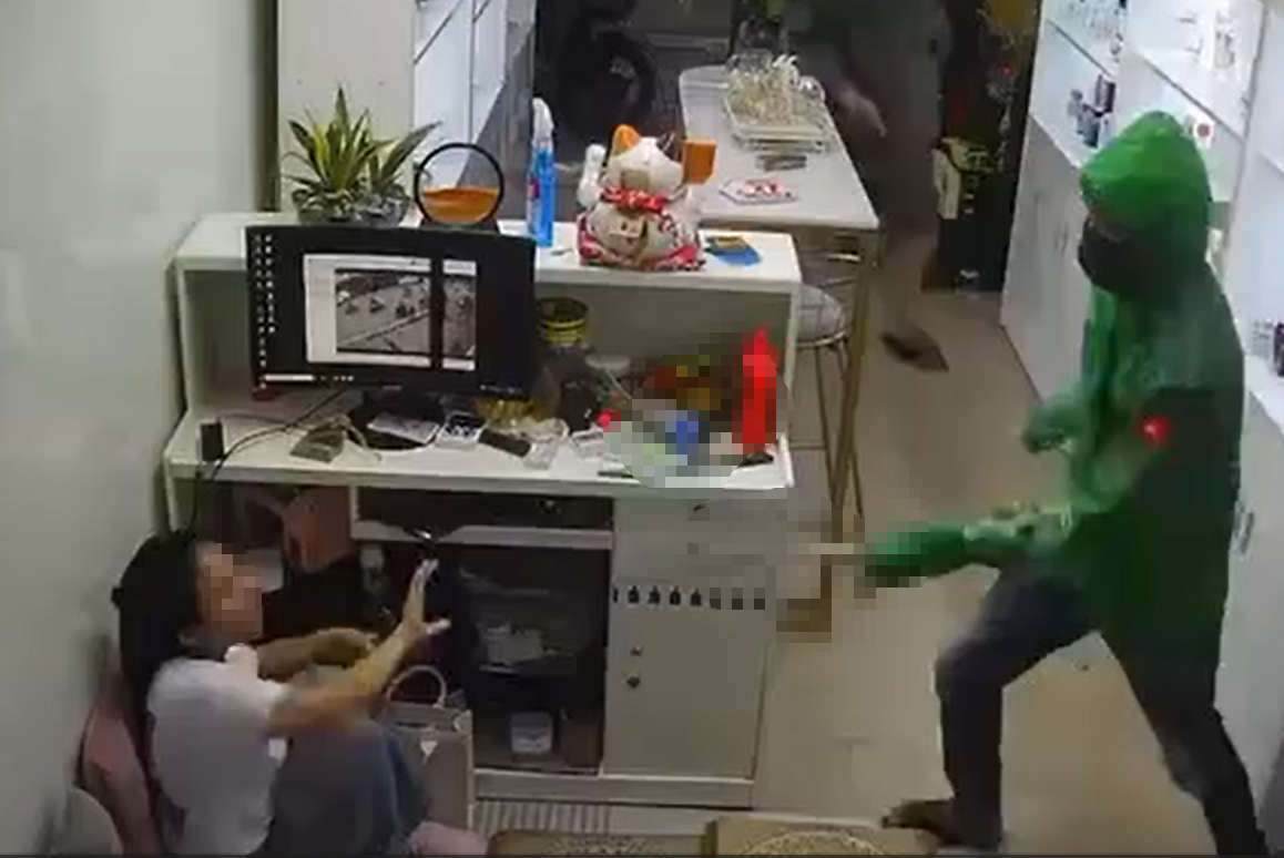 Nhóm đối tượng này bịt kín mặt, đánh liên tiếp vào 2 người ở trong cửa hàng, trong đó có một phụ nữ.