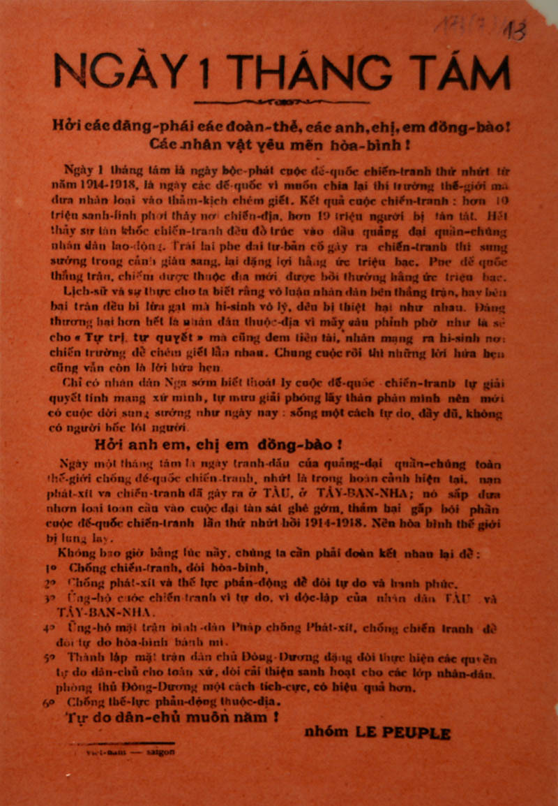 Các truyền đơn tố cáo chính sách áp bức bóc lột của thực dân Pháp cùng bè lũ tay sai, đồng thời kêu gọi các tầng lớp nhân dân đoàn kết đấu tranh chống áp bức, phản đối chiến tranh, đánh đổ phong kiến và đế quốc thực dân để giành tự do, độc lập dân tộc.