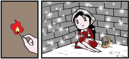 Trời càng lúc càng lạnh, cô ngồi xuống đất run rẩy và hối hận:"Vớ vỉn thật, đang trong chăn ấm lại mò ra đường thế này có phải là ngu không, nghe thằng bạn xui dại đến là khổ!". Ngồi mãi ê cả mông, cô bật que diêm thứ nhất...