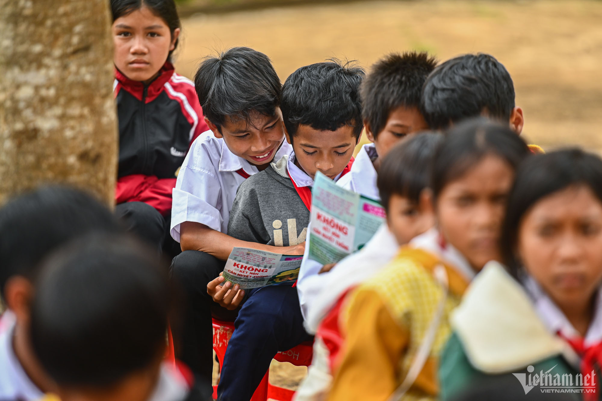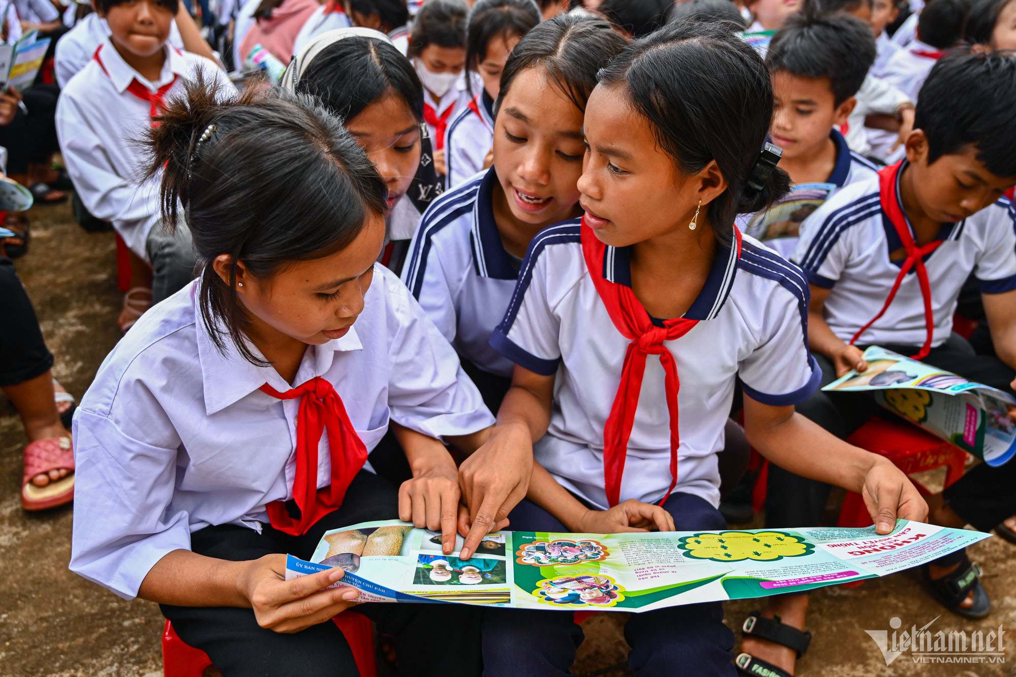 Các em học sinh được cung cấp nhiều tài liệu, tờ rơi tuyên truyền với hình ảnh sinh động, dễ hiểu về nội dung phòng ngừa tảo hôn và hôn nhân cận huyết thống.