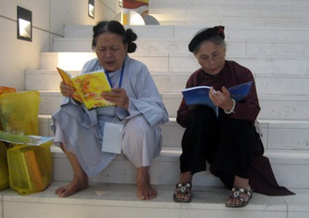 | Phật tử đang đọc các ấn phẩm Phật giáo |