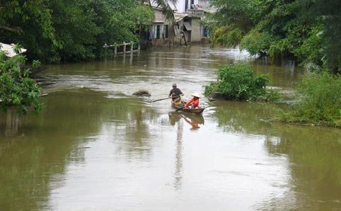 | Nhiều tuyến đường tại TP. Huế và huyện Quảng Điền đã biến thành sông, người dân đi lại chỉ bằng ghe và thuyền nhỏ. |