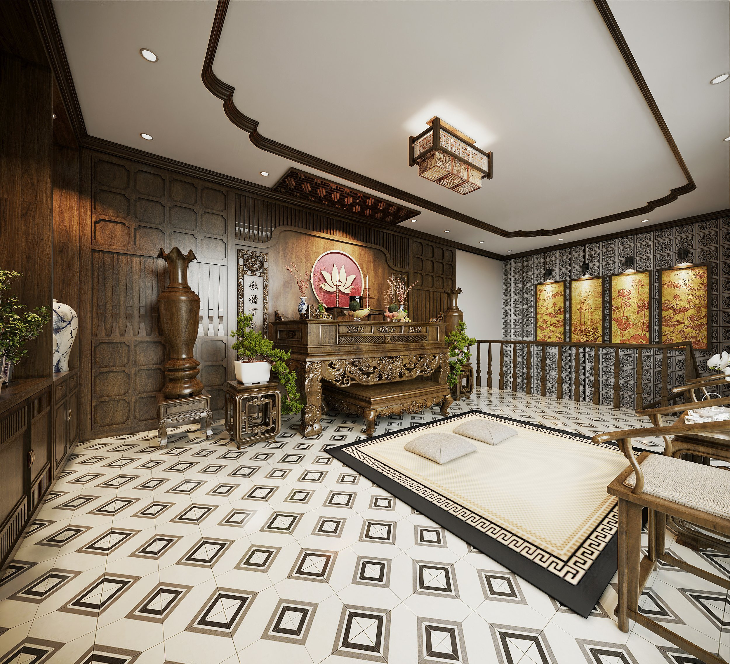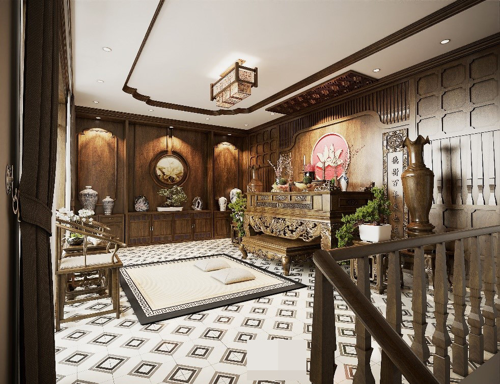 Tiếp nối tầng 1 với không gian hoài cổ là phòng thờ được bố trí nằm ở tầng 2.