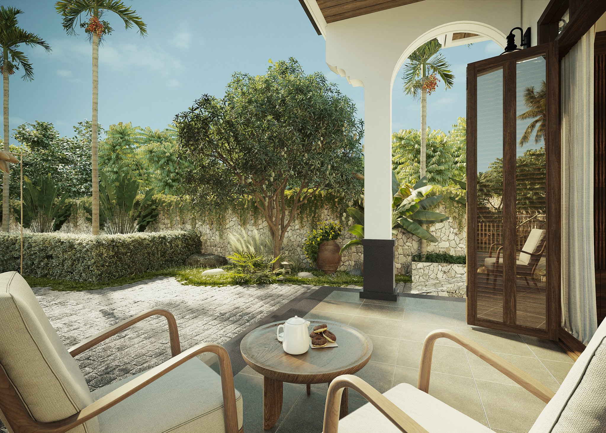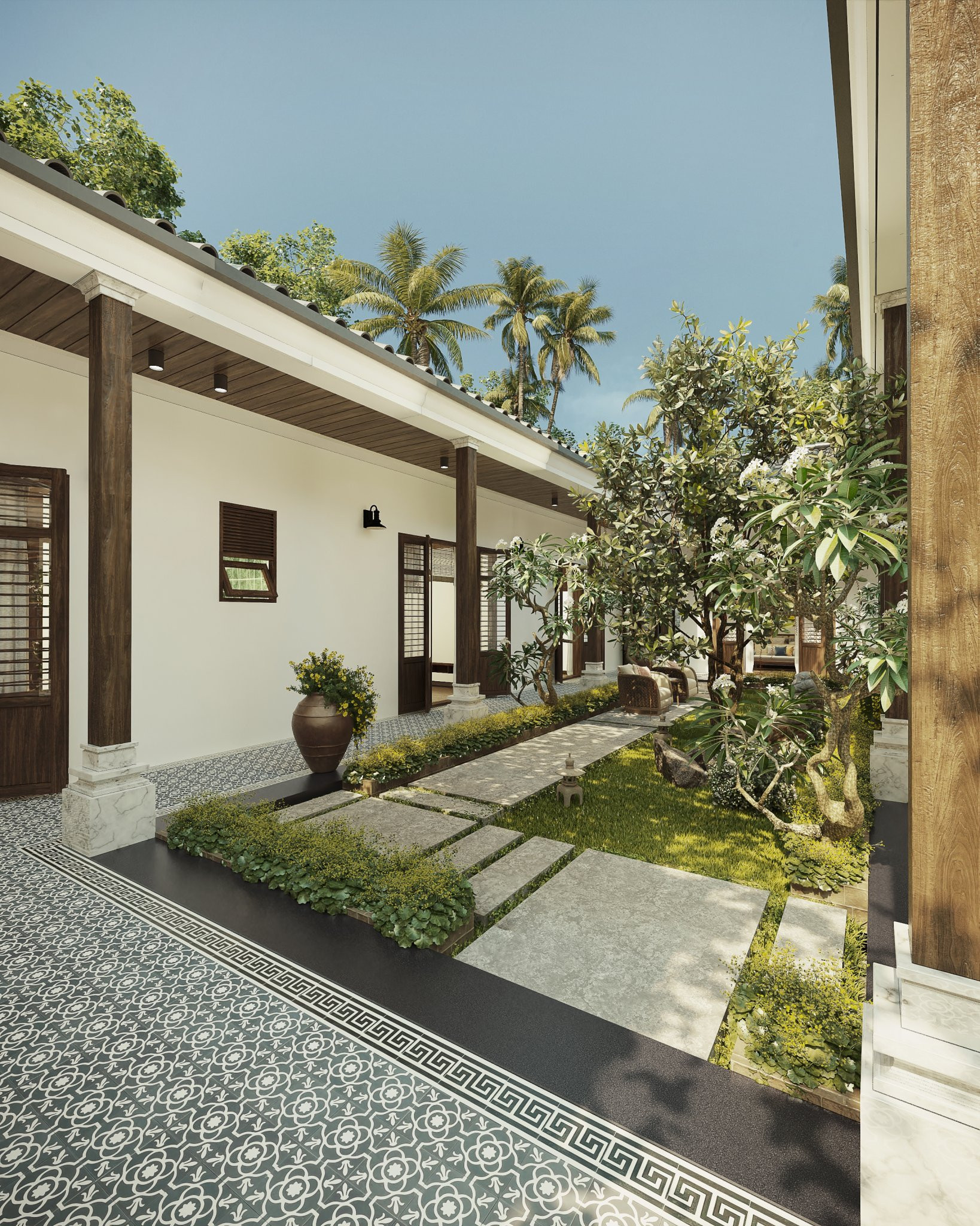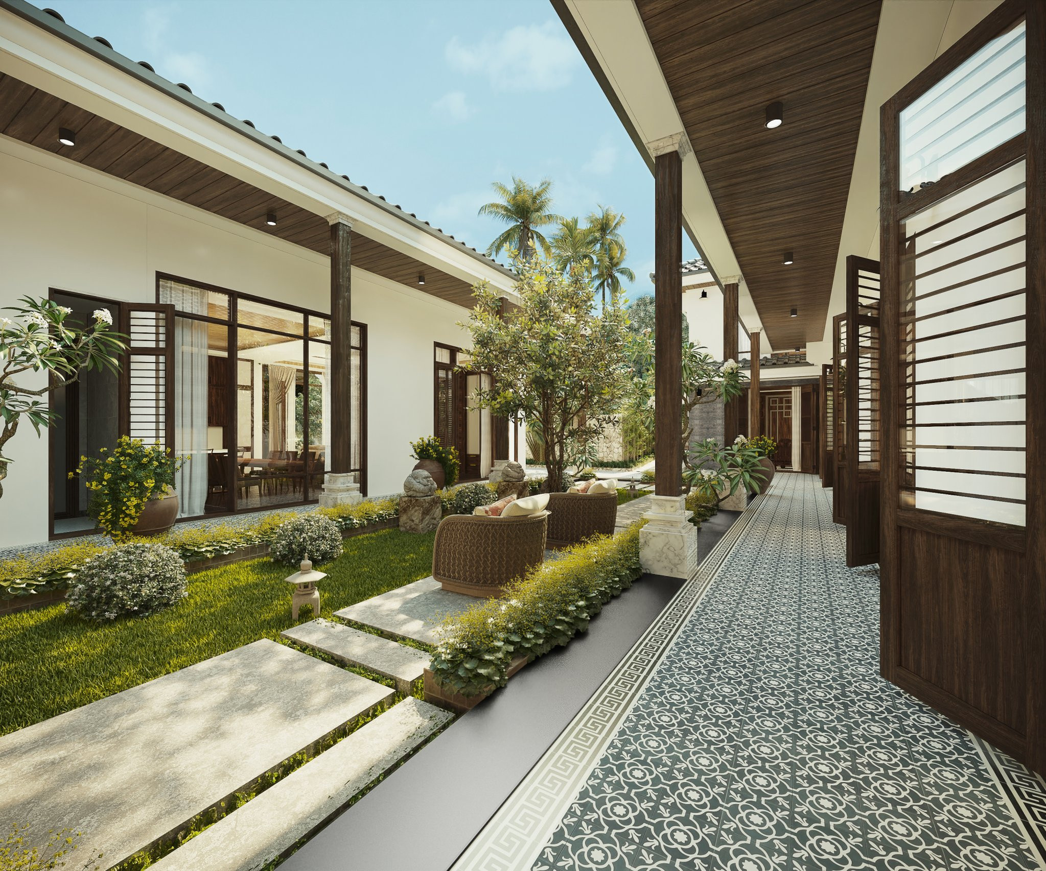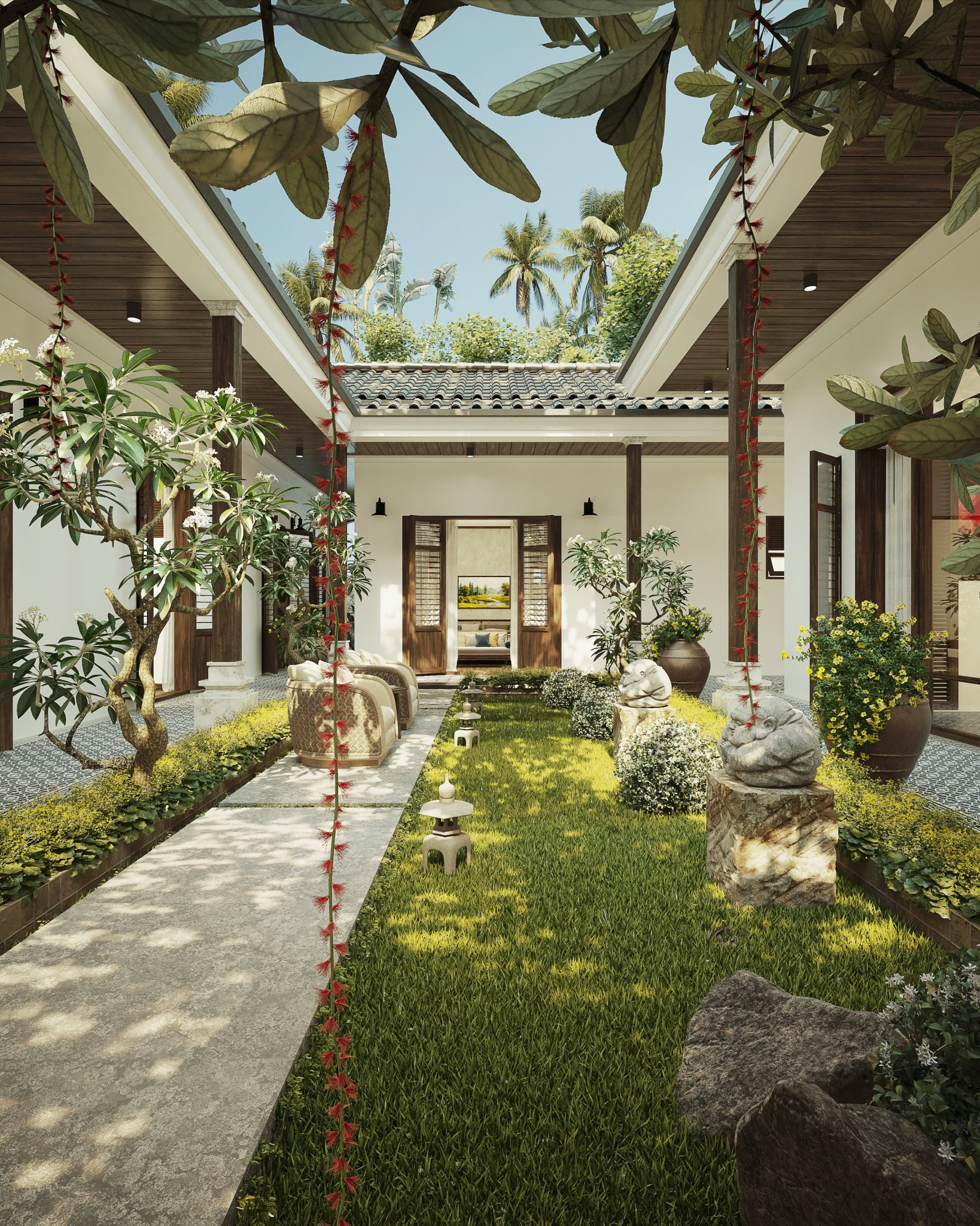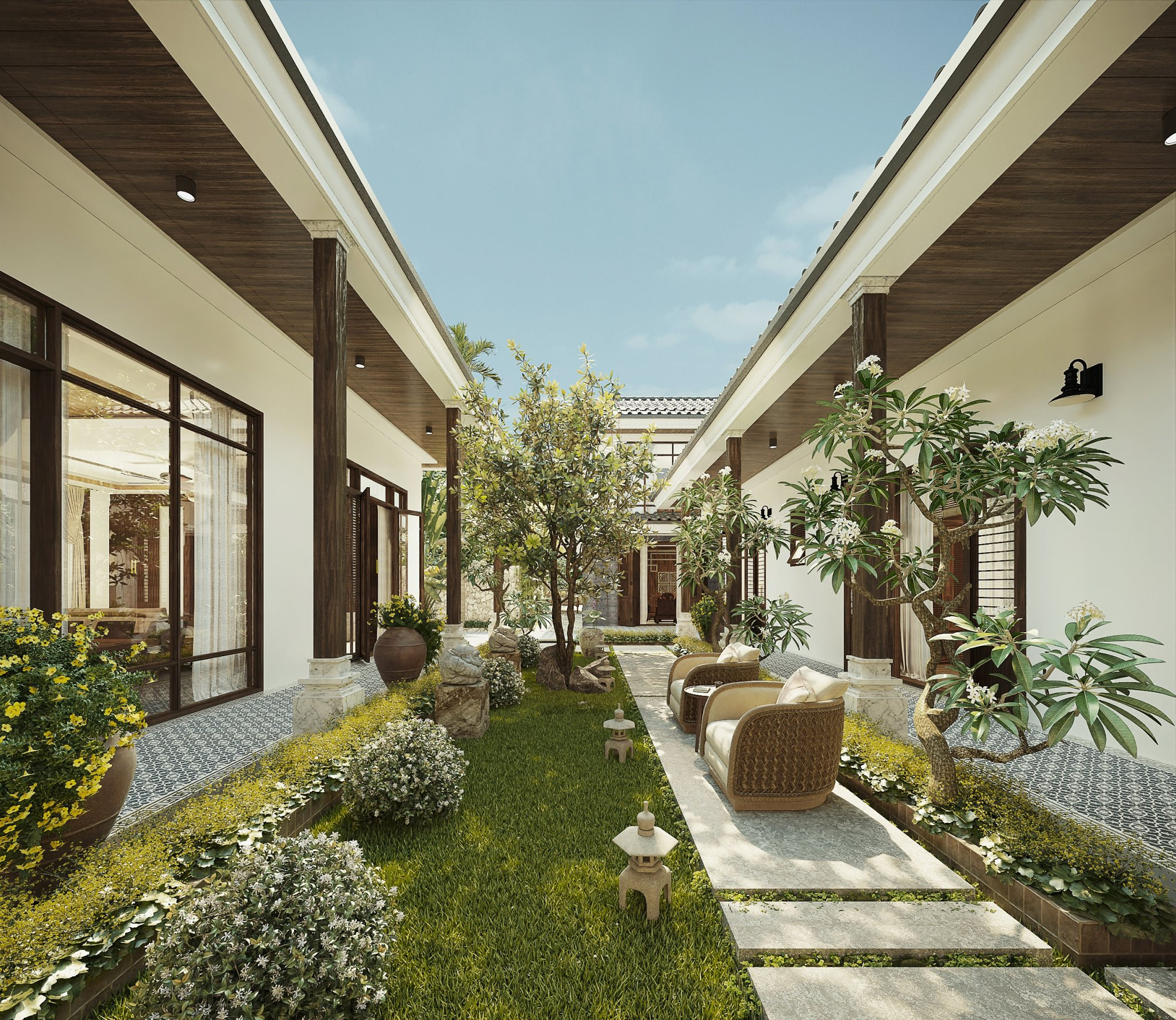 Sân vườn yên tĩnh, trong lành được đội ngũ thiết kế chú trọng, tỉ mẩn đến từng viên gạch, ngọn cỏ.