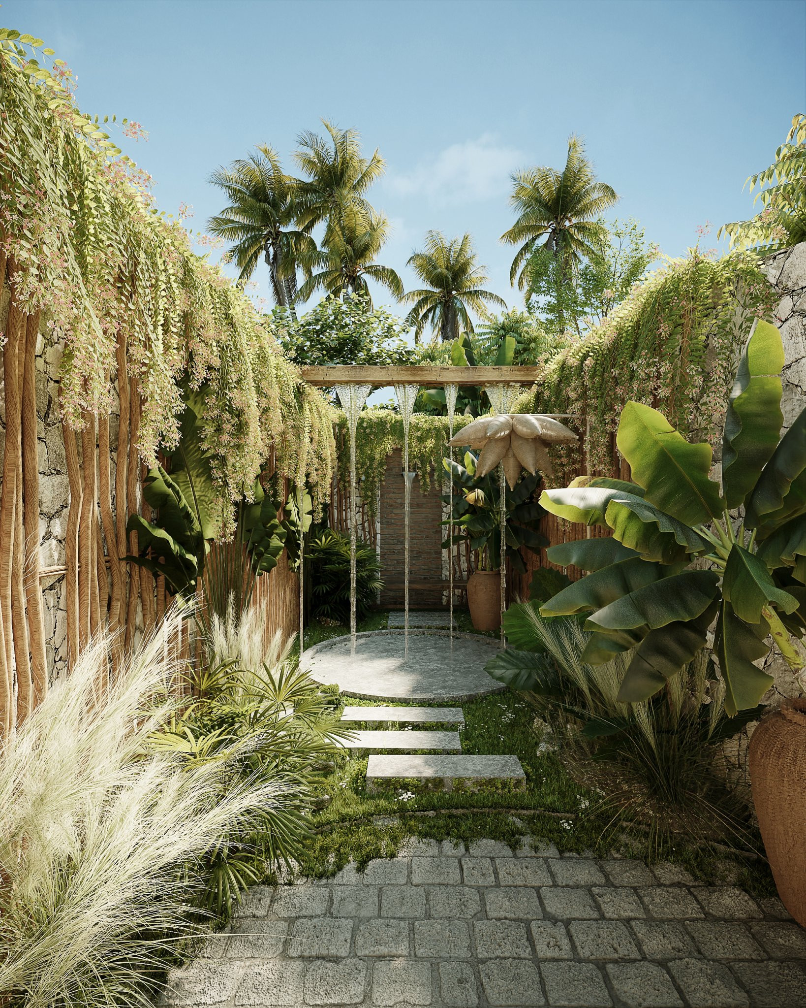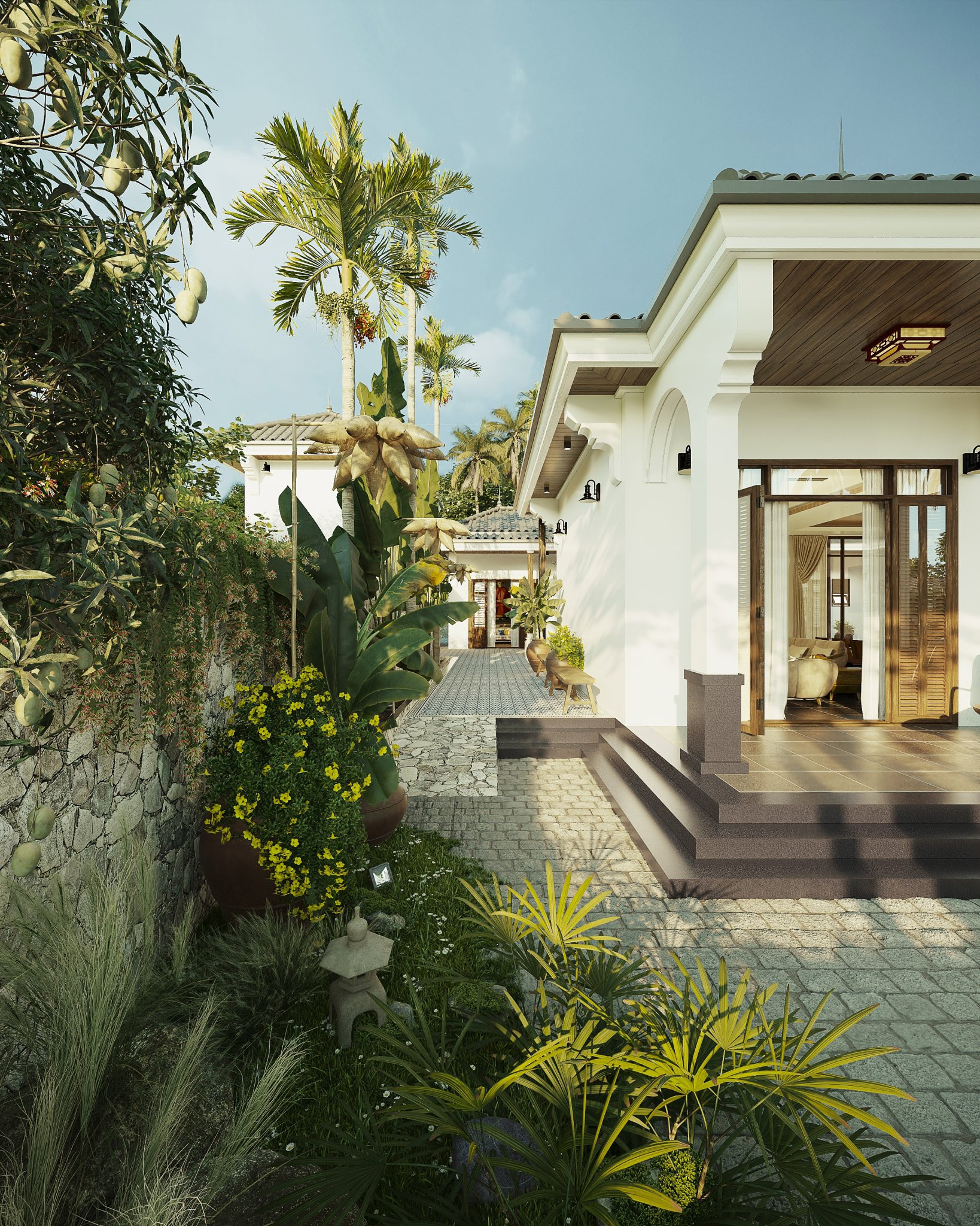 Bên hông là một lối đi nhỏ hướng vào phía sau nhà giúp dễ dàng tiếp cận với các khu vực bếp hay phòng ngủ của từng thành viên mà không cần đi qua phòng khách. Men theo bờ tường được bố trí một hàng cau rợp bóng mát, xen kẽ đó là những khoảng trống trồng cây bụi tạo cho lối đi một cảm giác mát mẻ và thư thái.