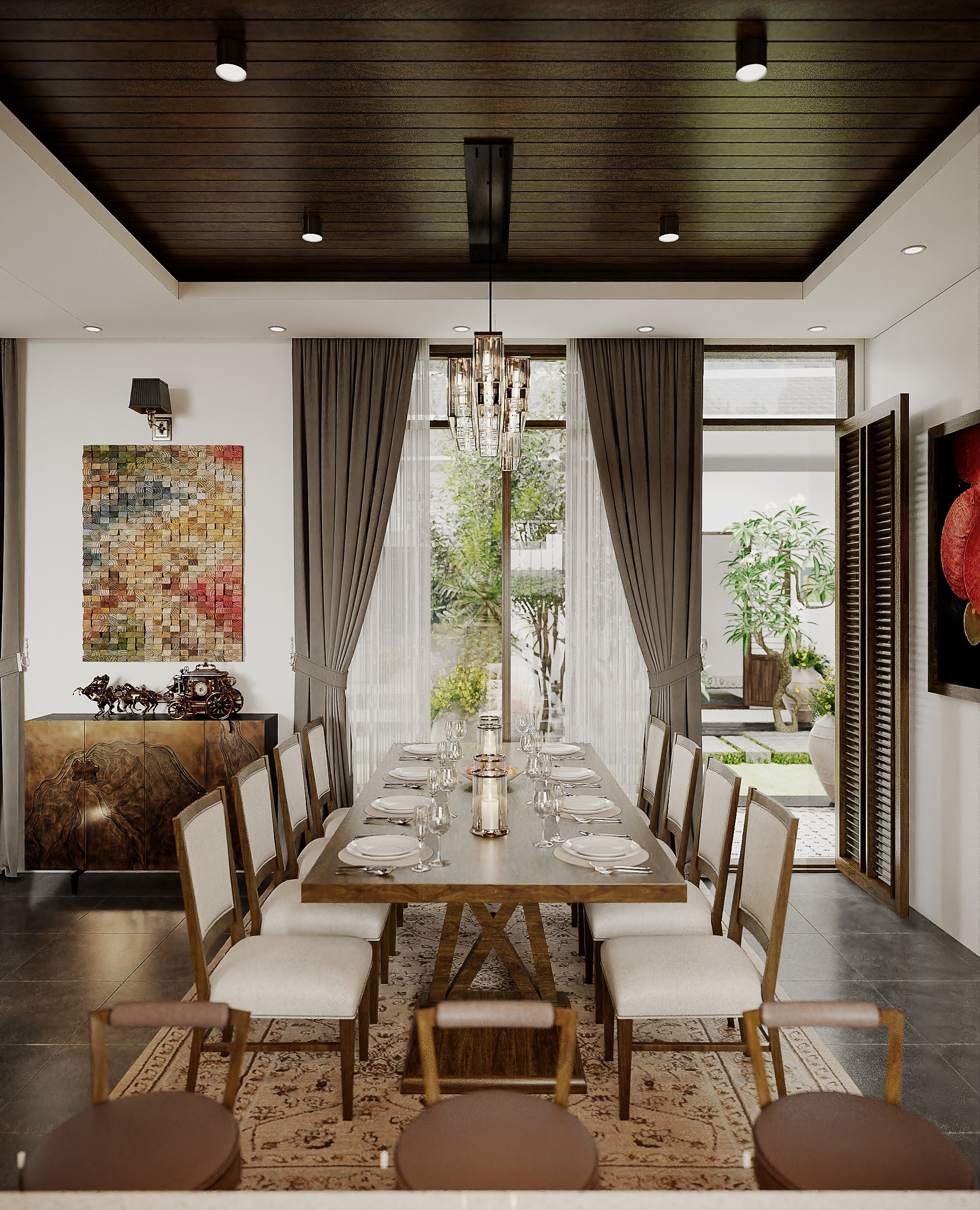 Bàn ăn được đặt cạnh cửa hướng ra sân trong, buổi sáng mở rèm sẽ có ánh nắng nhẹ từ phía Đông len lỏi chiếu qua những tán cây bên ngoài. Một khung cảnh lý tưởng để người nội trợ chuẩn bị những món ăn tình cảm cho cả nhà sẵn sàng đón chào ngày mới.