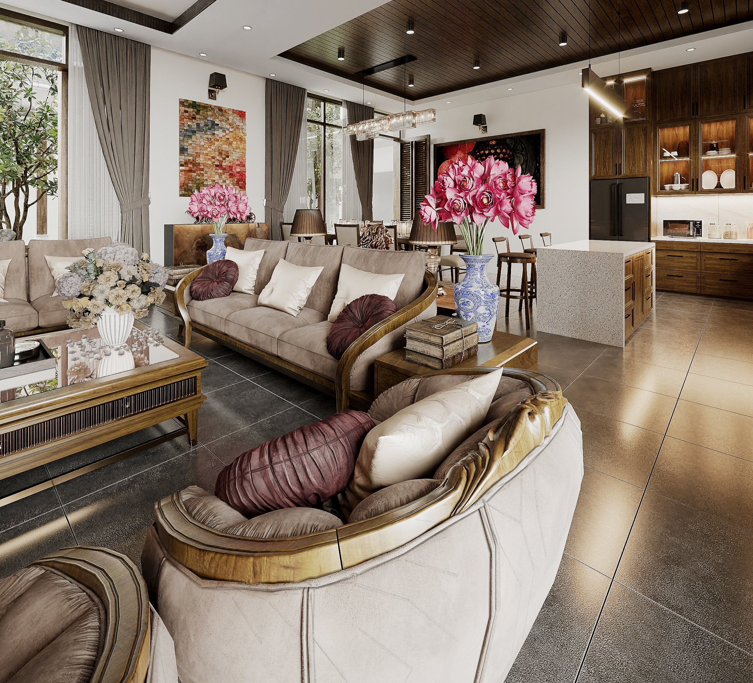 Phòng khách và bếp được bố trí liên thông với nhau. Người nấu ăn vẫn được quây quần, kết nối với các thành viên còn lại trong nhà.