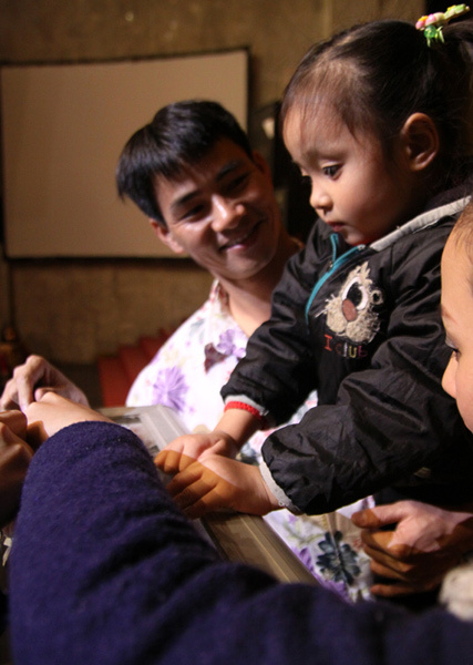 Nghệ sĩ Vân Dung bế một khán giả nhí bỏ tiền ủng hộ