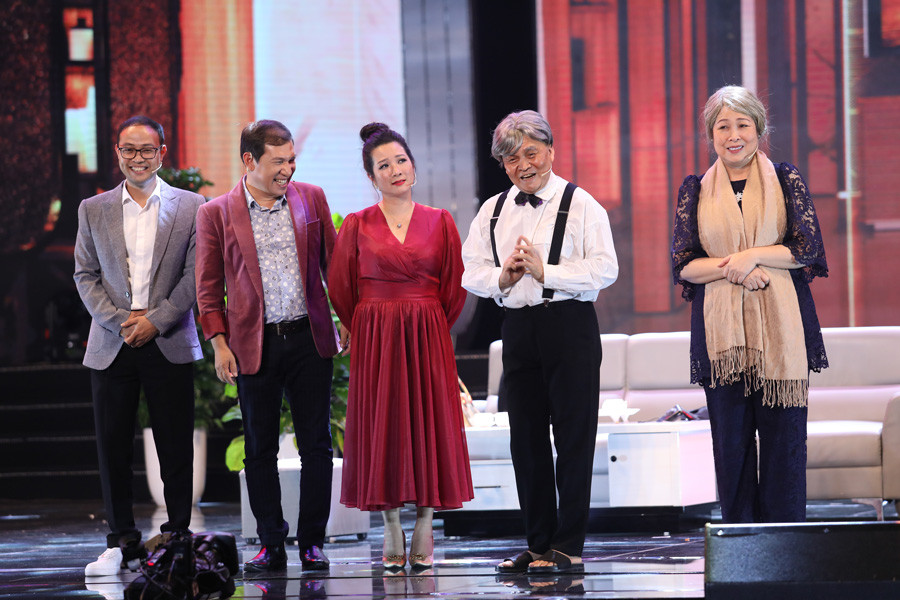 Hậu trường ghi hình 'Xuân phát tài' 13, NSND Tự Long cùng bạn diễn NSƯT Xuân Bắc ngồi bệt miệt mài tập thoại, NSND Hồng Vân và Xuân Hinh nhí nhảnh chụp hình.