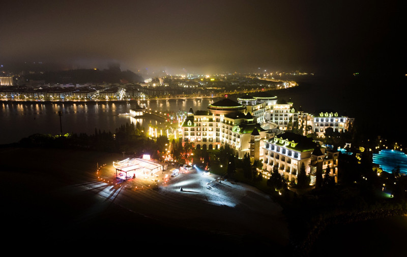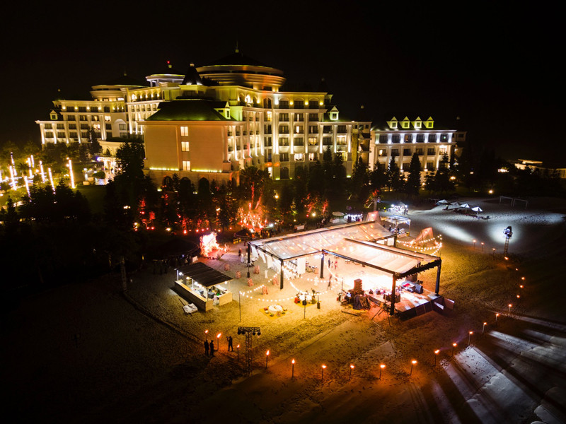 Hàng trăm du khách đã có những giây phút tận hưởng yến tiệc tưng bừng náo nhiệt, lễ hội rực rỡ và chứng kiến khoảnh khắc thăng hoa của câu chuyện tình yêu tuyệt đẹp. Giữa bãi biển thanh bình, cô dâu và chú rể chính thức nên duyên vợ chồng giữa những ánh đèn lung linh, không gian vịnh Hạ Long khoáng đạt, thơ mộng.