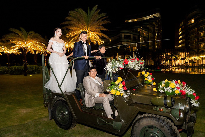Lễ cưới lại “Dancing with the stars” được tổ chức trên bãi biển với phần xuất hiện cực độc đáo của “chú rể” trên chiếc xe jeep và “cô dâu” trên chiếc xích lô - phương tiện đặc trưng văn hóa của Việt Nam đã khiến tất cả các khách mời trầm trồ.