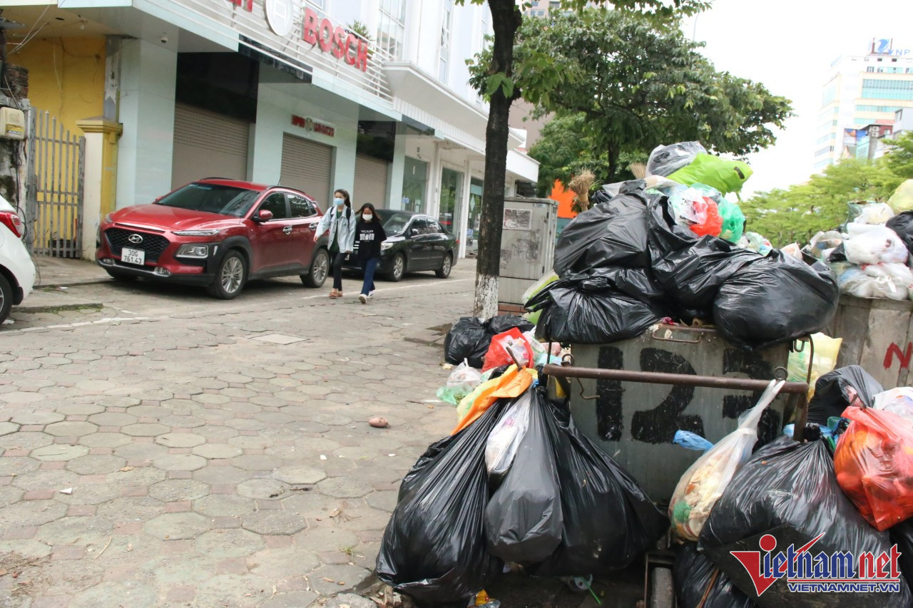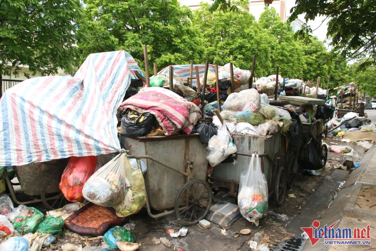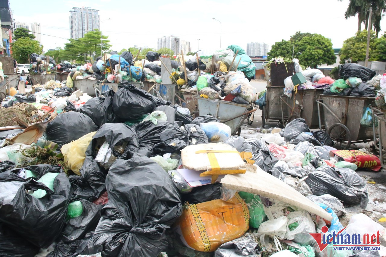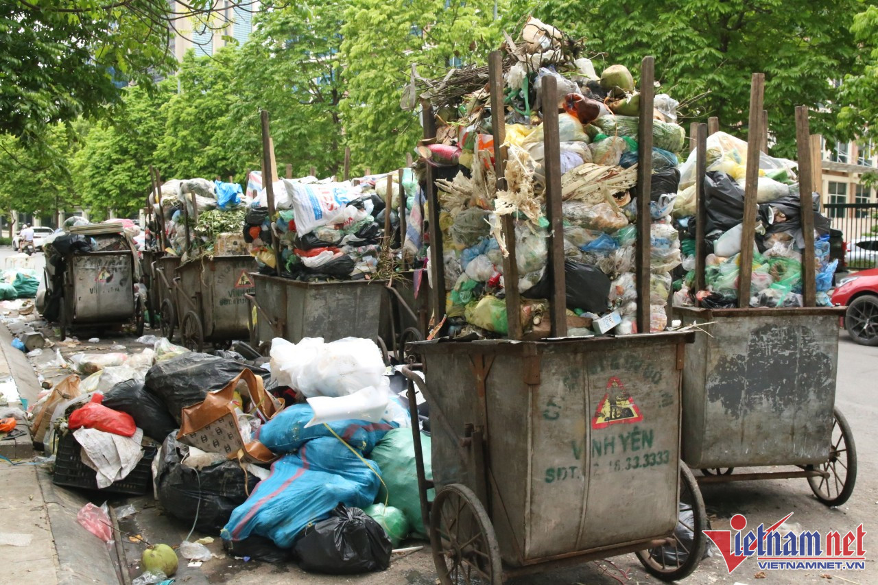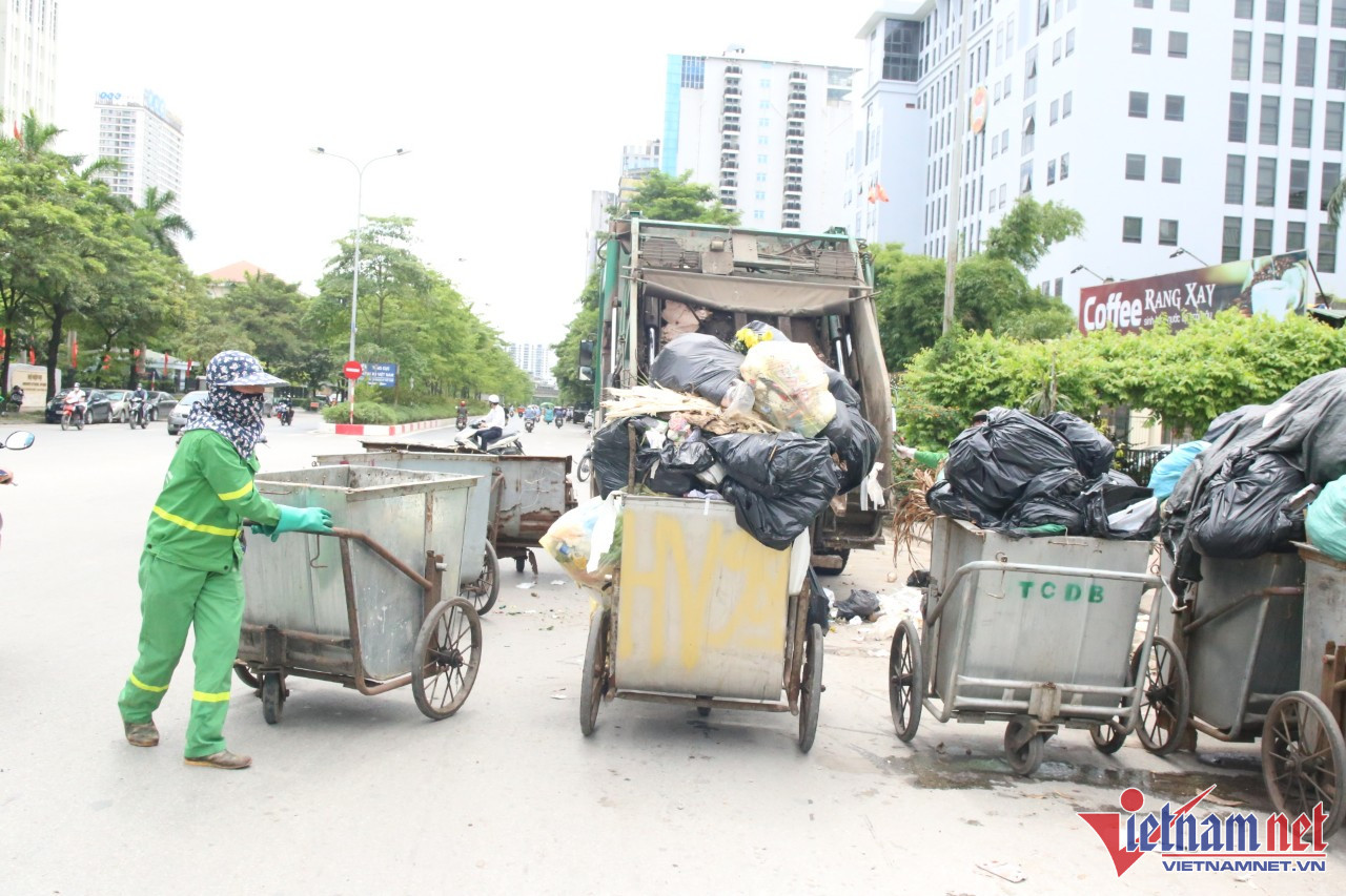 Ngày 17/6, trên nhiều tuyến phố nội thành Hà Nội như Duy Tân, Xuân Thuỷ, Trần Vĩ… rác thải sinh hoạt bị ùn ứ, chất đống. Nhiều xe rác chất túi to túi nhỏ "xếp hàng" dưới lòng đường.
