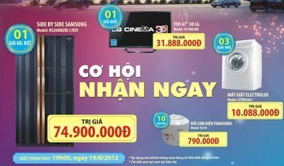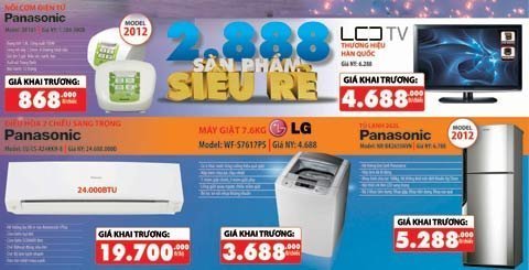 Tivi LCD 32" thương hiệu Hàn Quốc giá thị trường: 6.288.000đ được bán với giá không tưởng chỉ còn 4.688.000đ, máy giặt LG giảm ngay 1 triệu đồng chỉ còn 3.688.000đ. Tủ lạnh 262L Panasonic giá thị trường: 6.788.000đ giá bán không tưởng chỉ còn 5.288.000đ, Nồi cơm điện tử Panasonic 1.8L Giá thị trường 1.288.000đ Giá Bán không tưởng chỉ còn 868.000đ; Điều hòa Panasonic 2 chiều sang trọng giá thị trường 24.688.000đ Giá bán không tưởng chỉ còn 19.700.000đ…