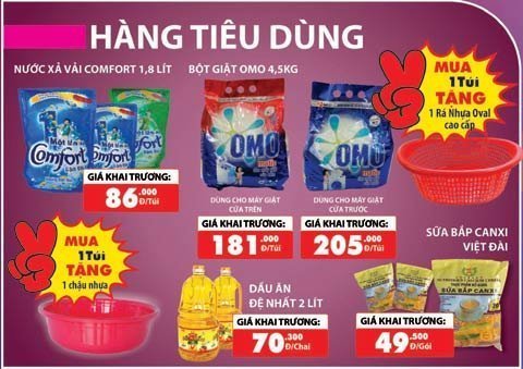 Bên cạnh đó, hàng nghìn các sản phẩm tiêu dùng giảm giá đặc biệt, tiêu biểu như: Nước xả vải Comfort 1.8l giá chỉ còn 86.000đ tặng thêm 1 chậu nhựa; dầu ăn Đệ Nhất 2L giá chỉ còn 70.300đ, Bột giặt Omo 4.5kg giá chỉ từ 181.000đ, Sữa bắp Canxi Việt Đài Giá chỉ còn 49.500đ ...