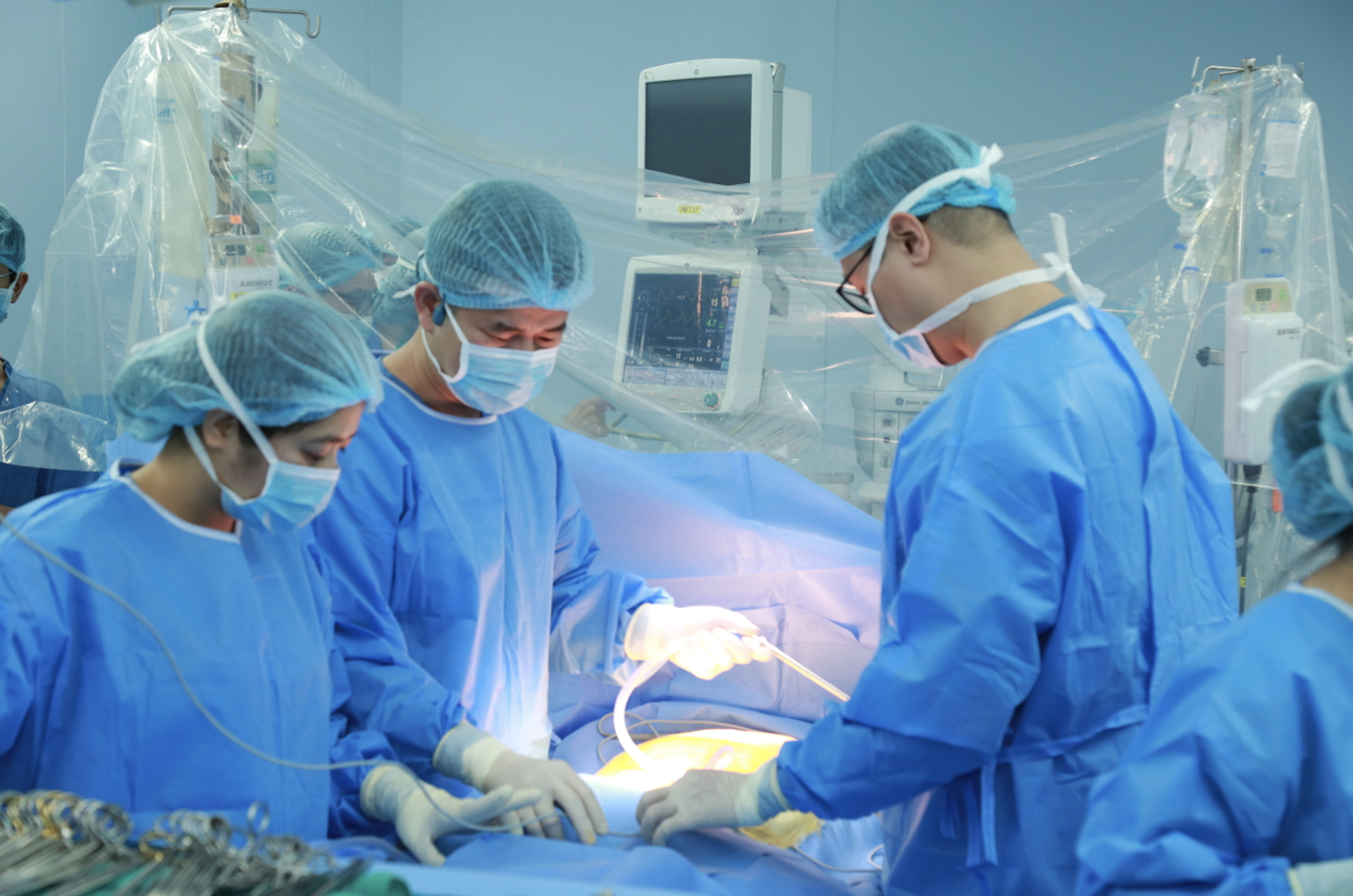 Bác sĩ, điều dưỡng thực hiện lấy tạng từ người hiến chết não và chuẩn bị lọc rửa tạng trước khi ghép tim tại Bệnh viện Trung ương Quân đội 108. Ảnh: BVCC