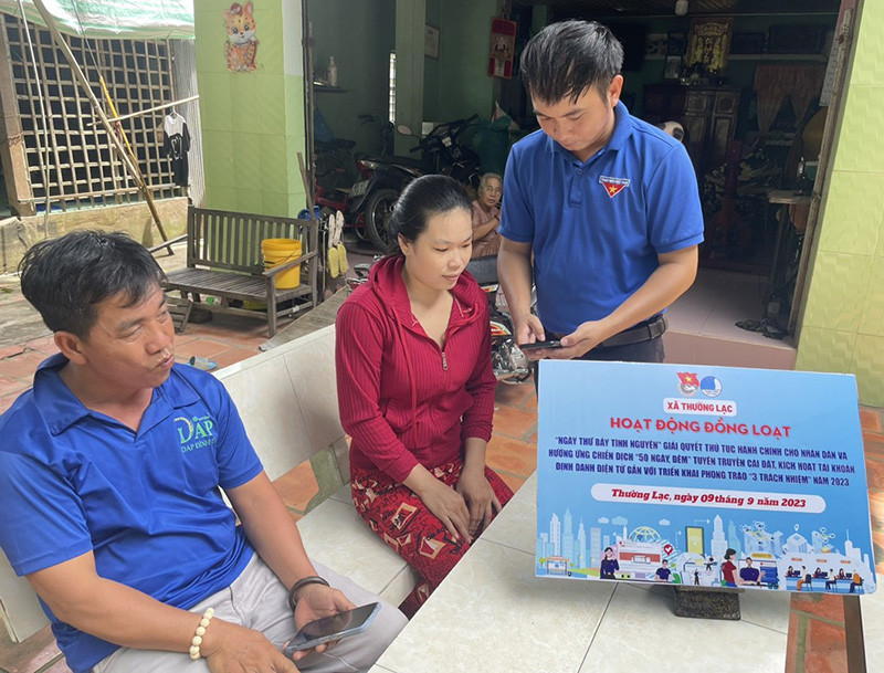 Đoàn viên, thanh niên xã Thường Lạc, huyện Hồng Ngự (bìa phải) hỗ trợ người dân cài đặt, kích hoạt tài khoản định danh điện tử trên ứng dụng VNeID
