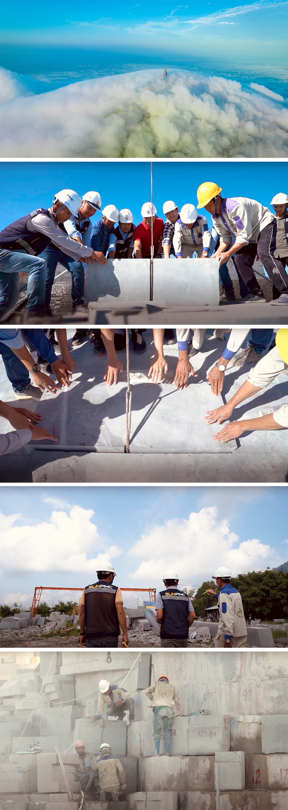 Tìm đá, điêu khắc đá đã kỳ công, nhưng quá trình ghép đá mới thật sự là thách thức. KTS. Phạm Thanh Quang cho biết: “Kiến trúc sư và kỹ sư của chúng tôi đã phải vừa học hỏi vừa áp dụng công nghệ thiết kế BIM mô hình hóa công trình hiện đại hàng đầu để triển khai phương án thi công. Tất cả các hạng mục kết cấu và những phiến đá đều được mô hình hóa 3D, sau đó được đánh dấu thứ tự cẩn thận rồi chế tác một cách chính xác trước khi được ghép thành một khối hoàn chỉnh”.