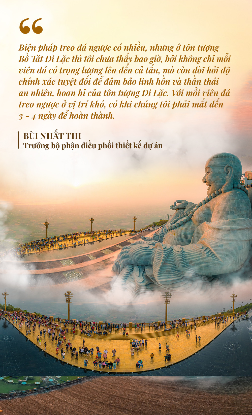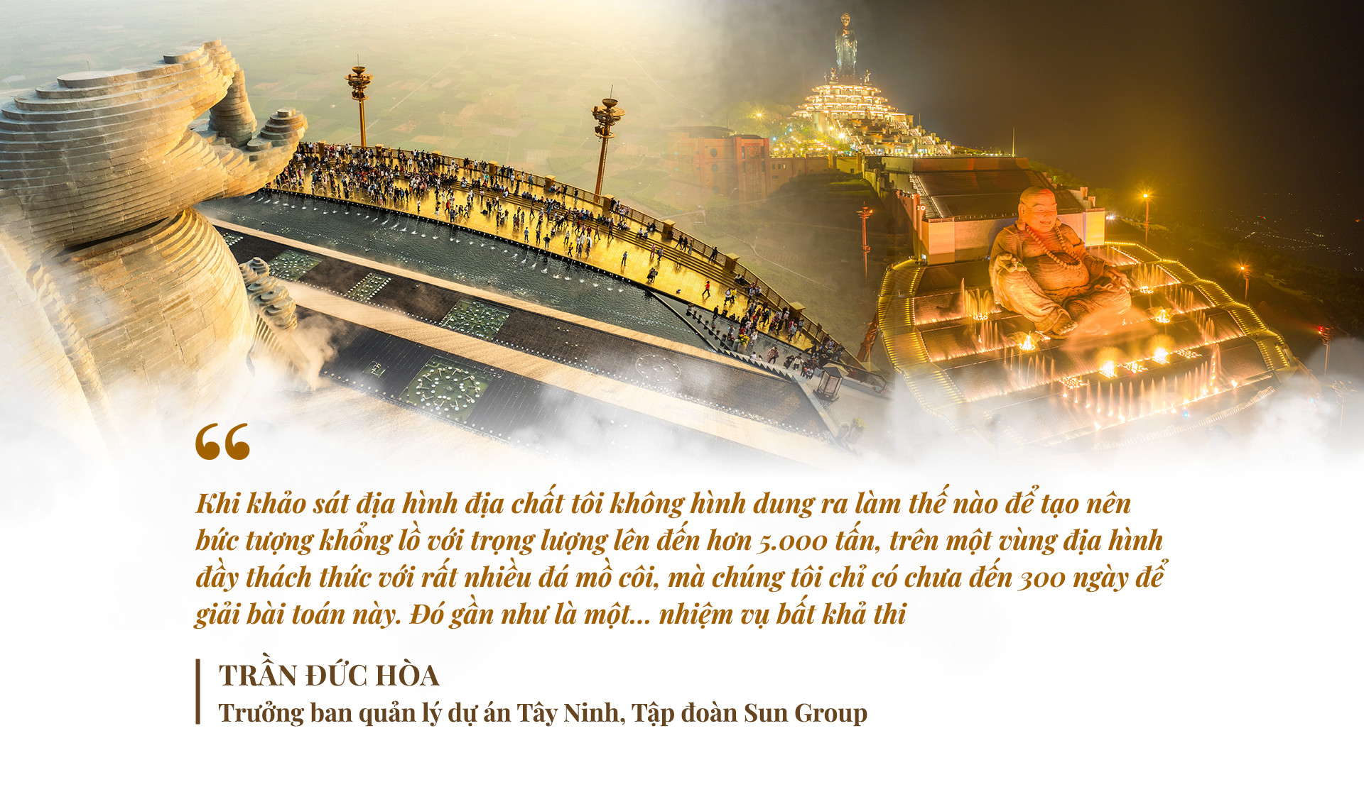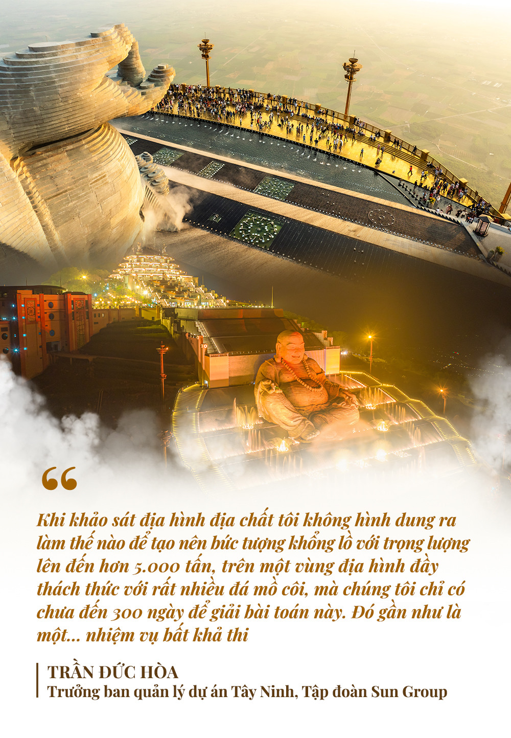 Giữa năm 2022, khi nhận nhiệm vụ giám sát và thi công tôn tượng Bồ Tát Di Lặc được ghép từ 6.688 viên đá sa thạch, mà mỗi viên mang một kích cỡ, một tạo hình duy nhất, mọi thứ dường như nằm ngoài sức tưởng tượng của các cán bộ ban quản lý dự án Tây Ninh thuộc tập đoàn Sun Group. Công trình nằm trên đỉnh phân thuỷ có địa hình dốc lớn của núi Bà Đen, khe tụ thuỷ chảy xuyên phạm vi địa hình, tạo ra chia cắt và thay đổi trạng thái địa chất.