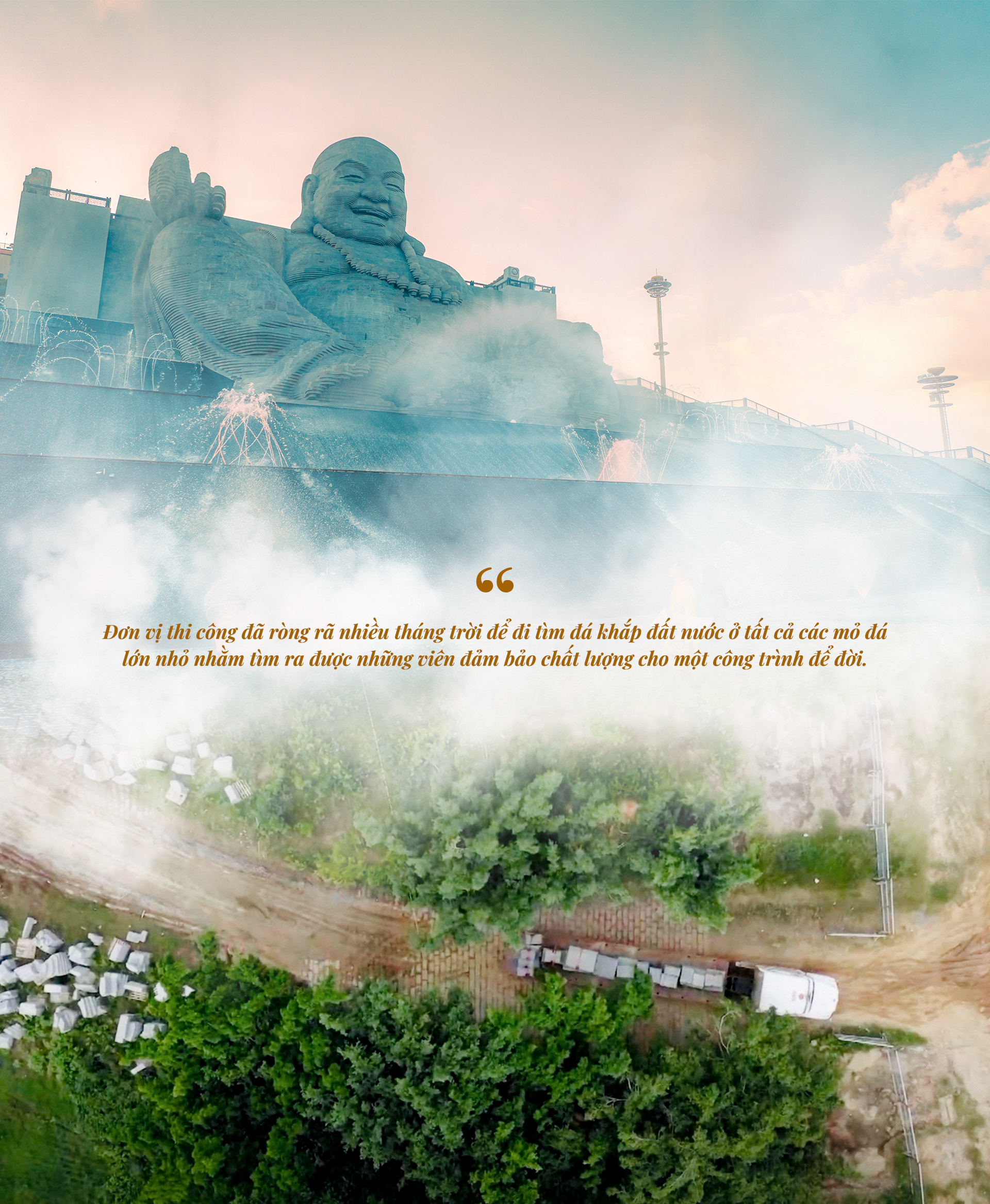 Anh Nguyễn Văn Chung đến từ nhà thầu Đá Việt Trung cung cấp đá cho công trình cho biết đây là lần đầu tiên tại Việt Nam dùng đá sa thạch để xây dựng tượng Phật. Đá sa thạch hình thành từ những hạt cát, trong đó có silic, một phần của đá vôi. Khi chế tác đá sa thạch, đòi hỏi người thợ phải có kỹ thuật và tay nghề rất cao và con mắt lành nghề mới có thể dùng búa, dùng đục để cắt bỏ những phần cần cắt bỏ, giữ lại những đường nét đẹp nhất và thổi hồn vào từng viên đá.