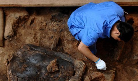 Việc khai quật được thực hiện rất công phu. Ảnh: Tân Hoa Xã. |