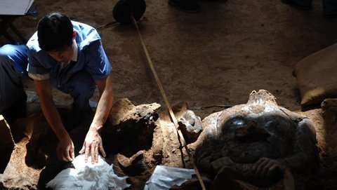 Một nhà khảo cổ đang chăm chút thực hiện công việc đưa pho tượng khổng lồ ra khỏi lòng đất. Bức tượng này có kích thước lớn hơn hẳn so với những pho tượng khác. Ảnh: Tân Hoa Xã. |