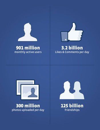 Để dễ tưởng tượng ra thị trường khổng lồ của Facebook đang nắm giữ, hiện nay, Facebook có 901 triệu người dùng thường xuyên hàng tháng, trong đó hơn 488 triệu (54.16%) sử dụng thông qua điện thoại. Trung bình, 500 triệu người sử dụng Facebook hằng ngày. Facebook có 70 ngôn ngữ và 80% người dùng nằm ngoài Mỹ và Canada.