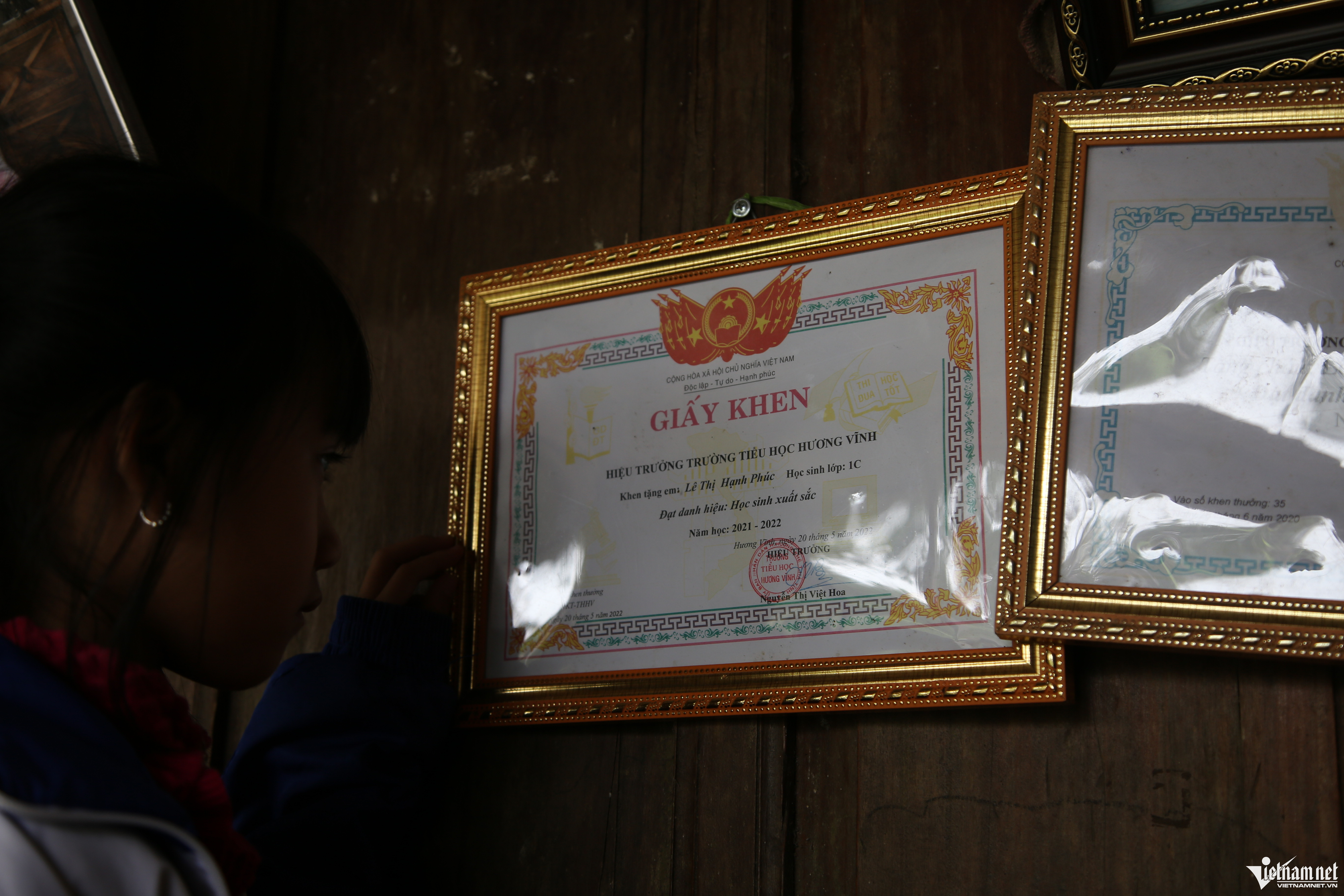Ngắm nhìn hai đứa cháu xinh xắn, trong veo phải sống trong hoàn cảnh cơ cực, bà Cận đau xót: "Giá như ngày trước tôi không cạn nghĩ thì không nên gán ghép cho vợ chồng thằng Thắng lấy nhau. Giờ chúng nó sinh ra hai đứa cháu ngoan ngoãn tôi càng đau lòng, lo lắng cho tương lai, cho số phận của bọn trẻ. Hạnh Phúc mới học lớp 3 nhưng rất ngoan, chăm học và học rất giỏi. Cháu rất hiểu chuyện và hơi trầm buồn".