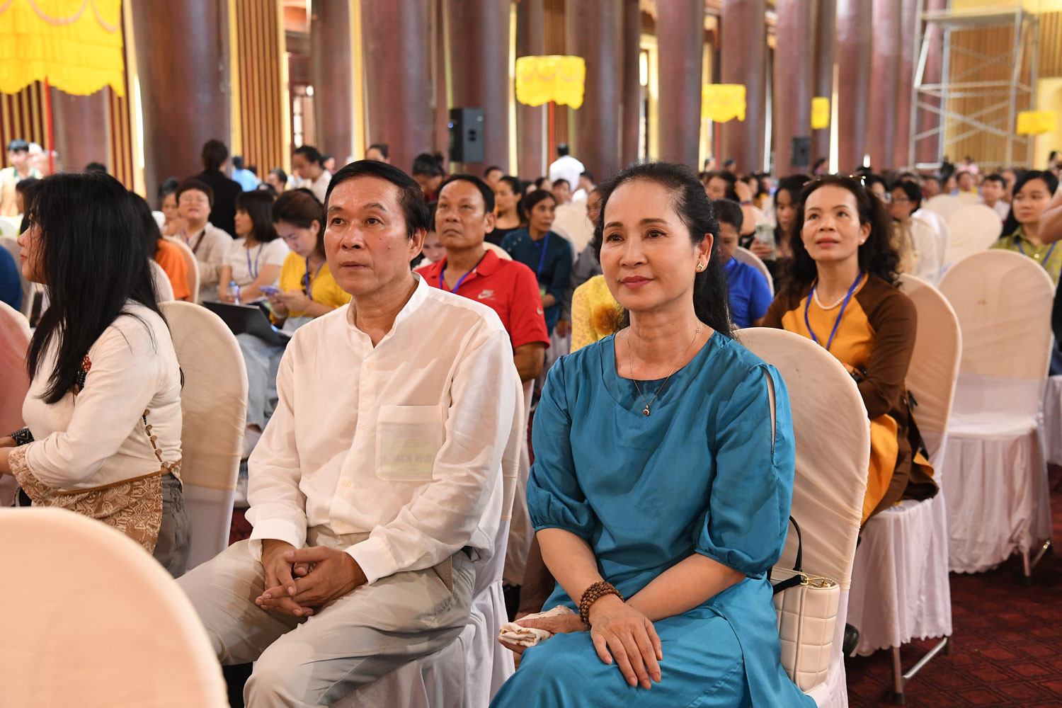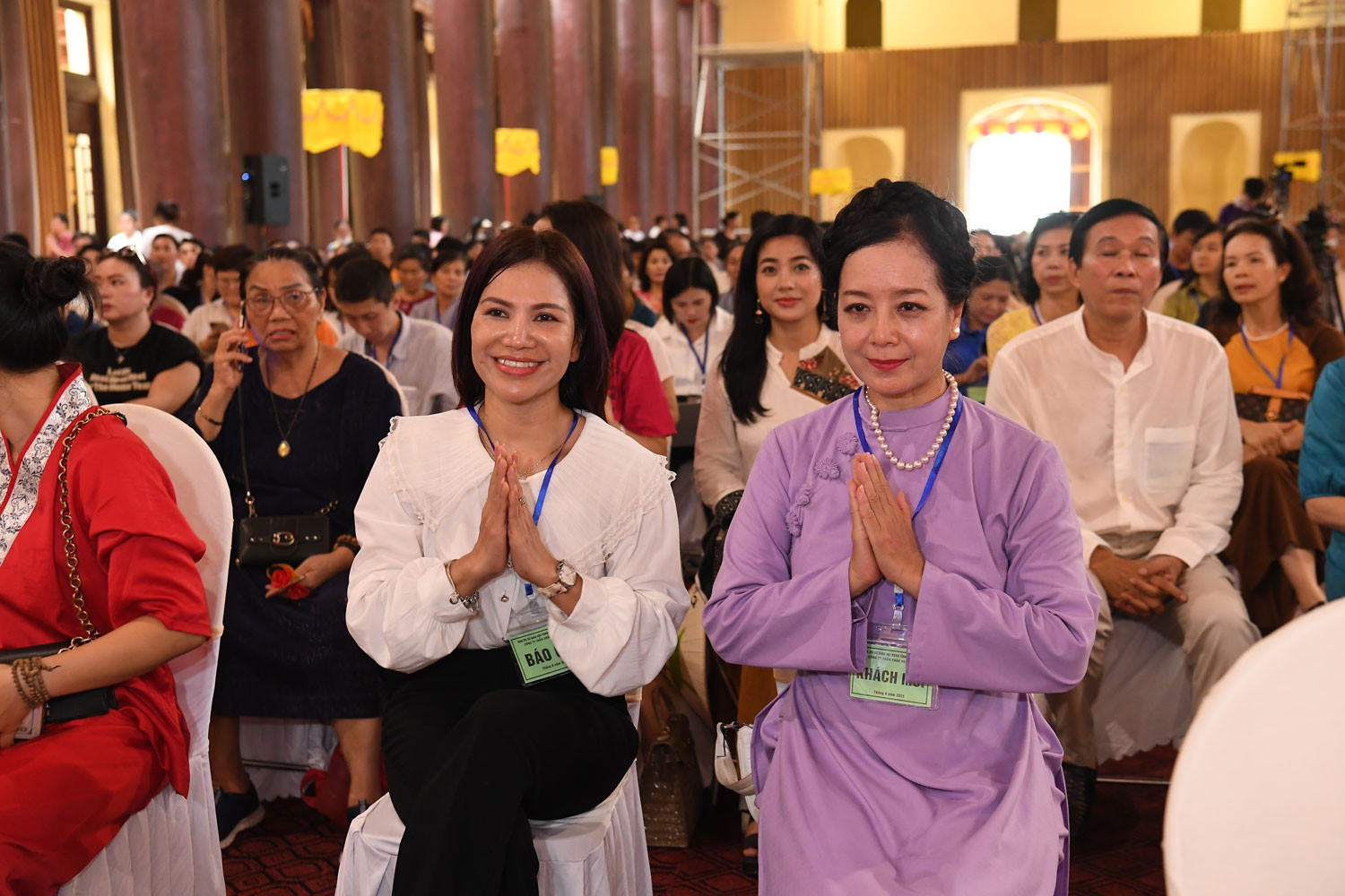 NSND Lan Hương, NSƯT Đỗ Kỷ, NSƯT Chiều Xuân, diễn viên Đàm Hằng hoan hỉ chứng kiến việc chú nguyện khai tượng Phật hoàng Trần Nhân Tông và tái khởi công chế tác bảo tượng Phật ngọc Thích Ca Mâu Ni.