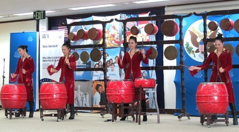 Đó là một phần của buổi biểu diễn do các nghệ sĩ đương đại Việt Nam thực hiện diễn ra sáng 15/3 tại Tổng lãnh sự quán Hoa Kỳ tại TP.HCM, nhân dịp phái đoàn Center Stage sang Việt Nam.