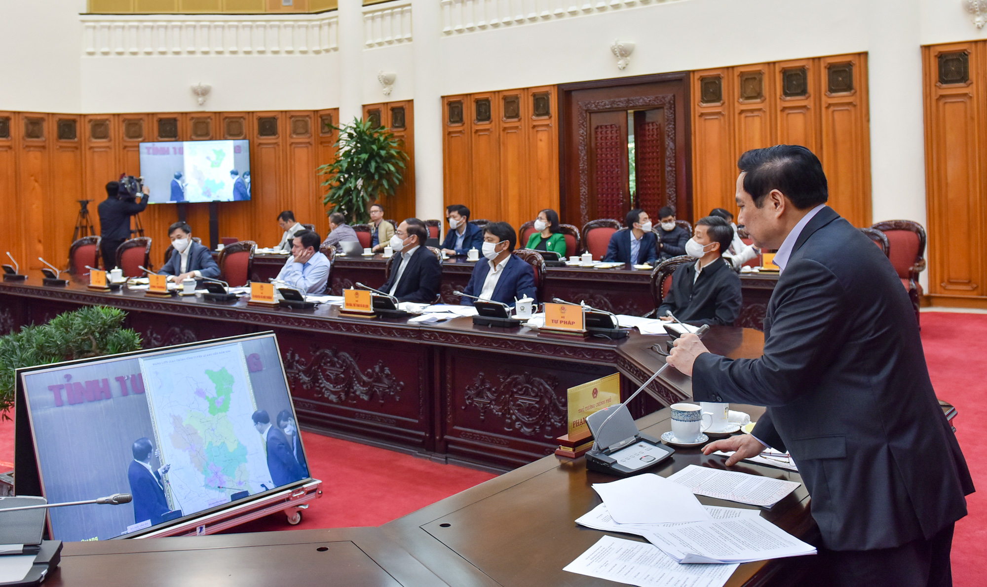 Lắng nghe báo cáo của tỉnh, Thủ tướng Phạm Minh Chính yêu cầu lãnh đạo Tuyên Quang trình chiếu bản đồ cùng thuyết minh cụ thể để các đại biểu có thêm căn cứ xác định các định hướng, ý tưởng phát triển thời gian tới, đặc biệt là trong kết nối hạ tầng giao thông liên vùng.