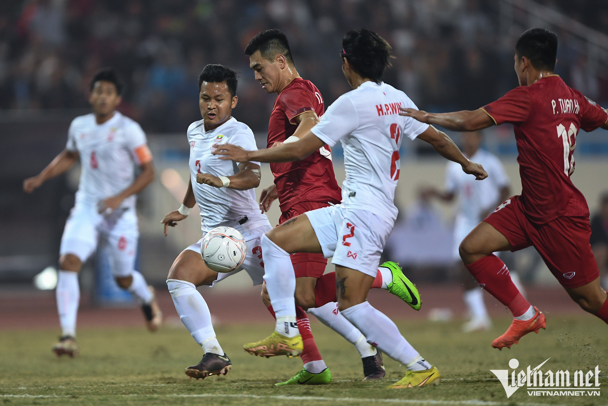 Các học trò của HLV Park Hang-seo mặc dù có những phút đầu để đối thủ lấn lướt bên phần sân của mình nhưng ngay ở phút thứ 8, từ một pha phối hợp của bốn cầu thủ CLB Hà Nội, Hùng Dũng mở bóng ra cánh trái cho Văn Hậu. Hậu vệ quê Thái Bình chuyền bóng cho Văn Quyết trước khi được căng ngang thuận lợi để Tuấn Hải đánh gót. Nỗ lực cản phá của Zin Lwin Kyaw không thành khiến anh đưa bóng về lưới nhà.