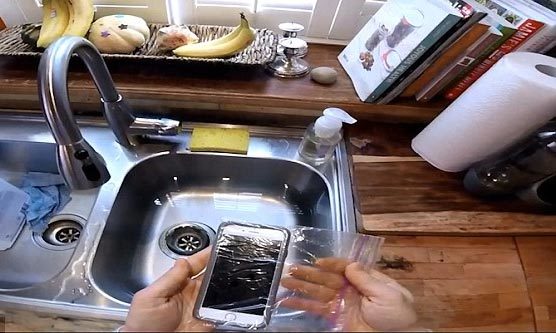 Trước hết người đàn ông cho chiếc điện thoại vào một túi nilon nhỏ có khóa kéo miết đầu, loại bỏ hết không khí rồi khóa chặt miệng túi. Sau đó, để chứng minh tuyệt chiêu có tác dụng, anh dũng cảm thả chiếc điện thoại của mình vào một bồn nước khoảng vài giây trước khi lấy nó ra ngoài và cho thấy điện thoại vẫn hoạt động bình thường.