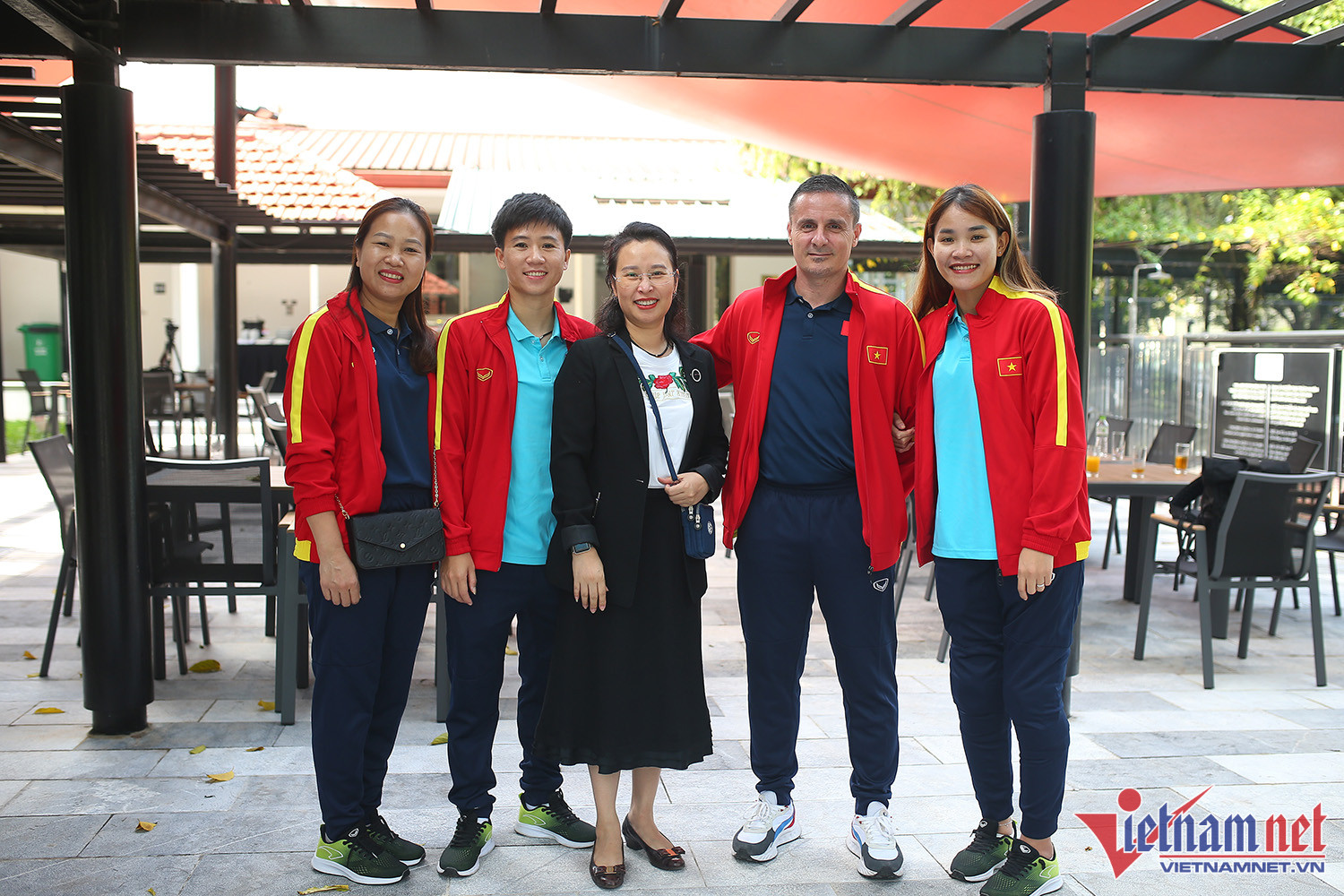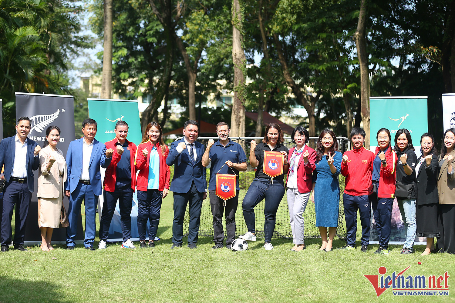 Tuyết Dung, Chương Thị Kiều cùng lãnh đạo Liên đoàn bóng đá Việt Nam vui mừng đón nhận kết quả bốc thăm World Cup nữ 2023.