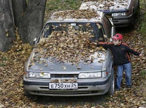 Một chú bé nghịch với lá rơi trên một chiếc xe tại thành phố Krasnoyarsk, Siberia, Nga.