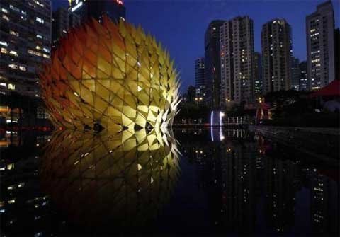 "Trăng vàng", một bức tượng hình đèn lồng khổng lồ, cao 18m và đường kính 21m được dựng lên ở Công viên Victoria, Hong Kong để mừng trung thu.