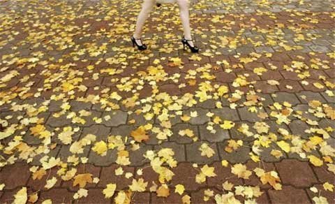Một người phụ nữ bước trên vỉa hè phủ đầy lá vàng ở Minsk