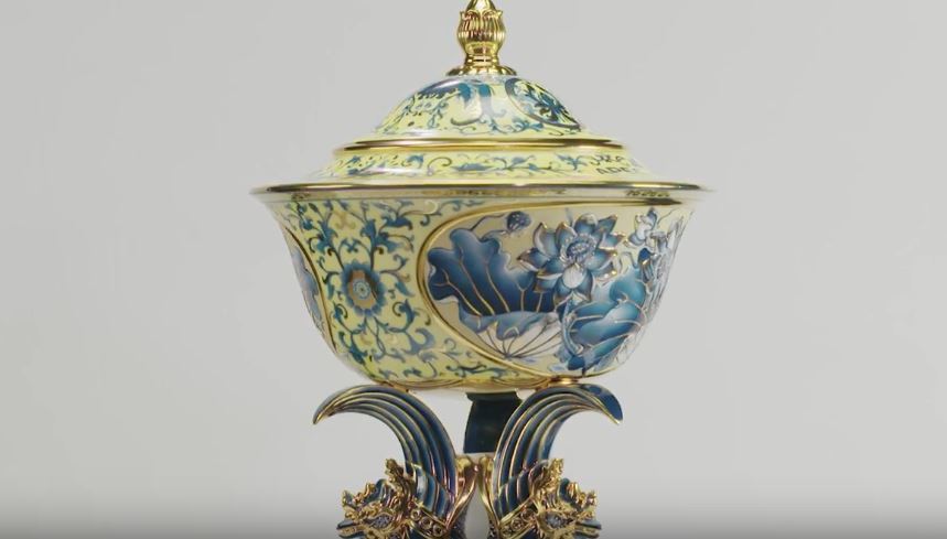 Các họa tiết, hoa văn được trang trí bằng vàng 24K trên tông xanh cobalt (blue Huế) đặc trưng, mang ý nghĩa thịnh vượng, sang trọng và đẳng cấp.
