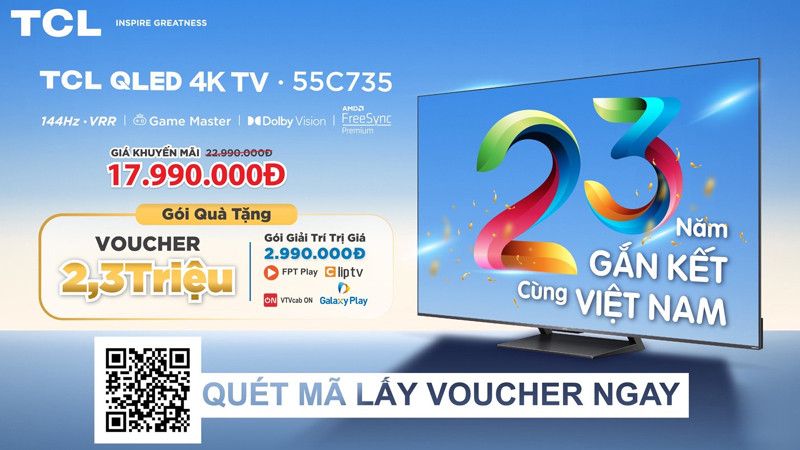 Theo đó từ ngày 01/10 - 31/10/2022, khách hàng được nhận ngay Voucher giảm giá lên đến 2,3 triệu đồng khi mua TCL QLED 65C735. Bên cạnh đó, khách hàng khi mua TV TCL còn được tặng thêm gói giải trí tại gia trị giá 2.990.000 đồng, bao gồm gói Galaxy Play 4K 12 tháng, gói Clip TV 12 tháng; gói VTVCab On 12 tháng gói cơ bản, gói FPT PLAY 12 tháng.