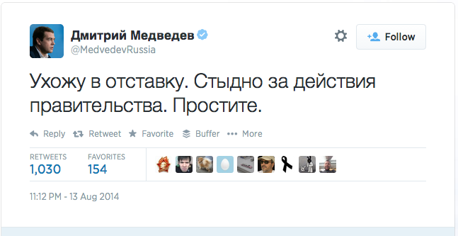 Theo trang The Interpreter, @MedvedevRussia, tài khoản đã được xác minh của Thủ tướng Medvedev với hơn 2,5 triệu người theo dõi, bắt đầu bị nghi vấn sau một tin tweet có nội dung: “Tôi sẽ từ chức. Tôi thấy xấu hổ vì hành động của chính phủ. Xin hãy tha thứ cho tôi”.