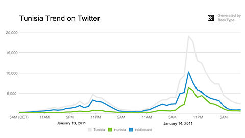 Christopher Golda, một nhà nghiên cứu về mạng xã hội Twitter đã cung cấp biểu đồ sự quan tâm của cộng đồng mạng thế giới liên quan tới sự kiện tại Tunisia vào đúng thời điểm ngày thứ 6 “đen tối”. Và vào lúc 9h30 tối theo giờ Tunisia (8h30 tối giờ GMT), sự kiện trên đã đạt đỉnh với 28 thông điệp mỗi giây được đăng tải trên Twitter, ngay sau khi bản tin đầu tiên về sự tháo chạy của tổng thống đương nhiệm Ben Ali được thông báo rộng rãi ra thế giới. Vào giữa sự kiện, sự quan tâm trên Twitter đã tăng vọt lên 196 ngàn user, trong đó chỉ riêng lượng user truy nhập từ các tỉnh xảy ra bạo loạn là 103 ngàn.
