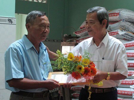 | Ngày 23/2, ông Phạm Thanh Phong (bên phải) - phó Chủ tịch TW Hội Khuyến học Việt Nam, Chủ tịch Hội Khuyến học tỉnh Long An tặng giấy khen tới ông Nguyễn Văn Biểu về thành tích nêu gương sáng người cao tuổi học tập suốt đời. |