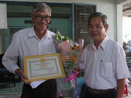 | Ông Phạm Thanh Phong (bên phải) tặng giấy khen tới ông Lê Văn Xê. |